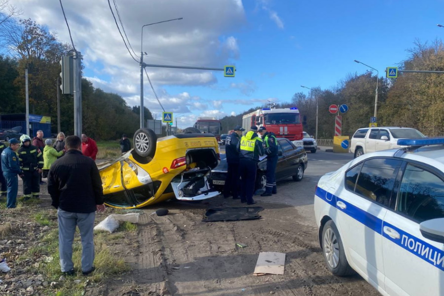Автомобиль такси от удара перевернулся на крышу. Его водитель и пассажирка Lada Priora пострадали.