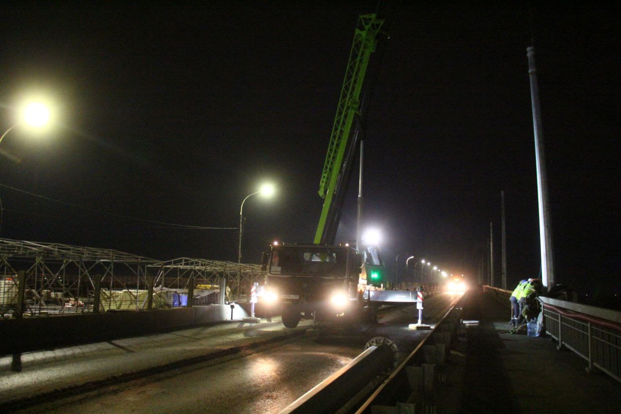 На отремонтированной части Ленинградского моста установили новые фонари, но они пока не светят. Рабочие смонтировали 28 опор освещения и контактной сети, а делали они это в ночное время. Подробности о работах рассказал в своем телеграм-канале мэр Омска Сергей Шелест: