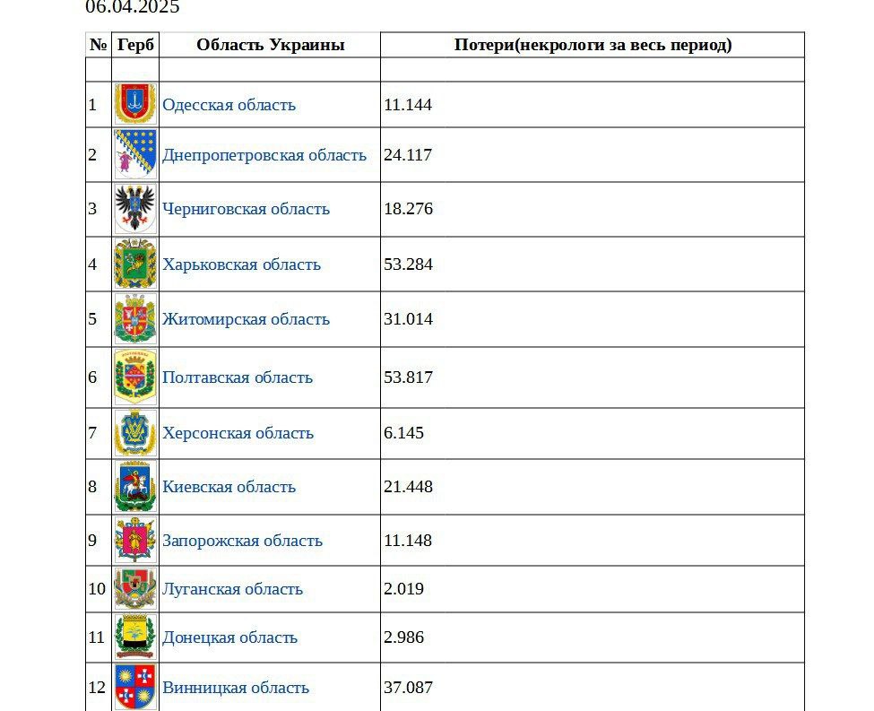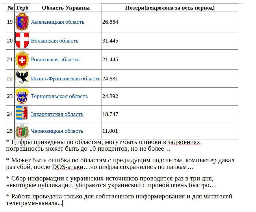 Количество некрологов и соответствующих потерь ВСУ и прочих военных формирований Украины по областям