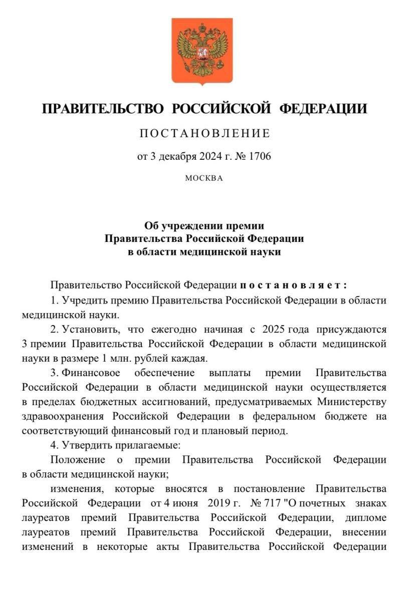 Правительство РФ учредило для отечественных ученых премии в области медицинской науки в размере 1 млн рублей, следует из постановления.