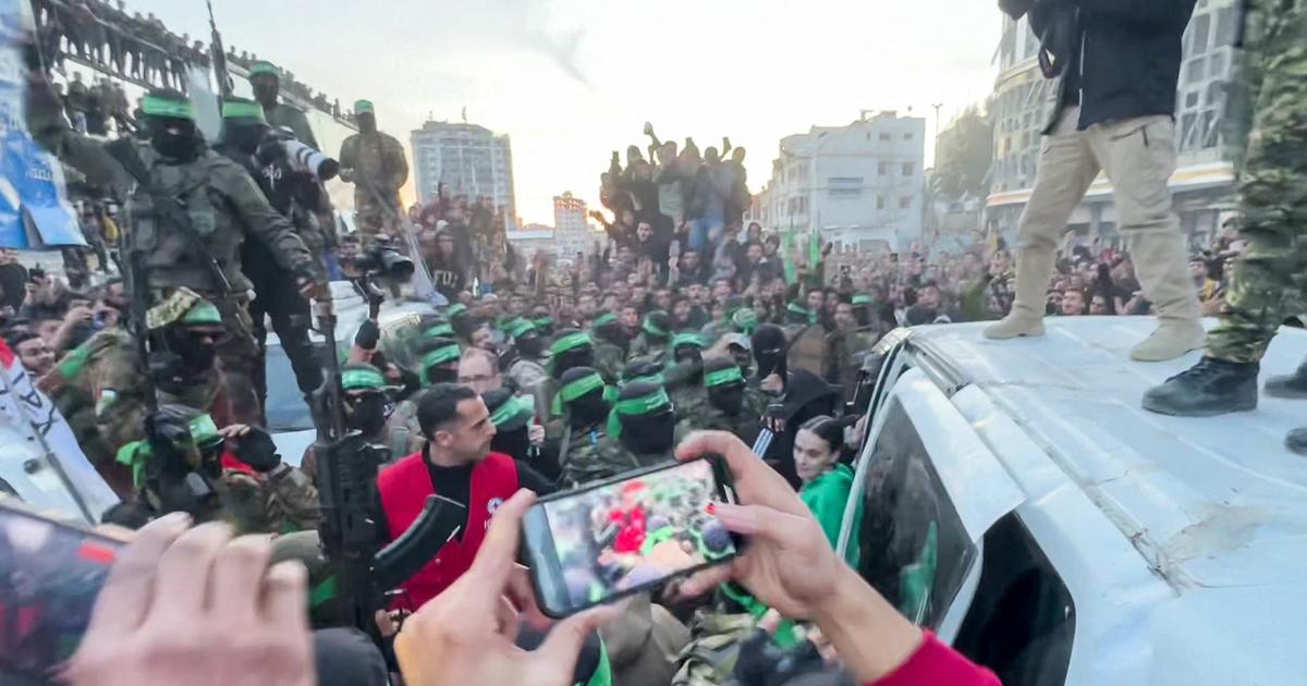 Place Saraya, dans la ville de Gaza, plusieurs dizaines de combattants armés du Hamas, encagoulés, bandeau vert ceint sur la tête et lunettes noires pour certains, remettaient les trois otages au Comité international de la Croix-Rouge internationale (CICR) chargée du transfert. Autour, une foule compacte de Palestiniens célébrait les combattants, aux cris de «Allah Akbar», assistant, selon les mots de David Horovitz, à une «grossière cérémonie d’auto-glorification».