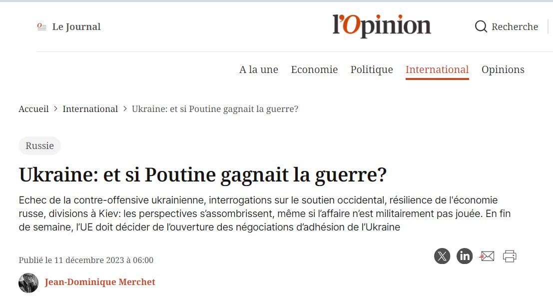 По мнению обозревателей французского издания L'Opinion, ситуация близка к тому, что запад вынудит украинское руководство пойти на мир на «российских условиях».