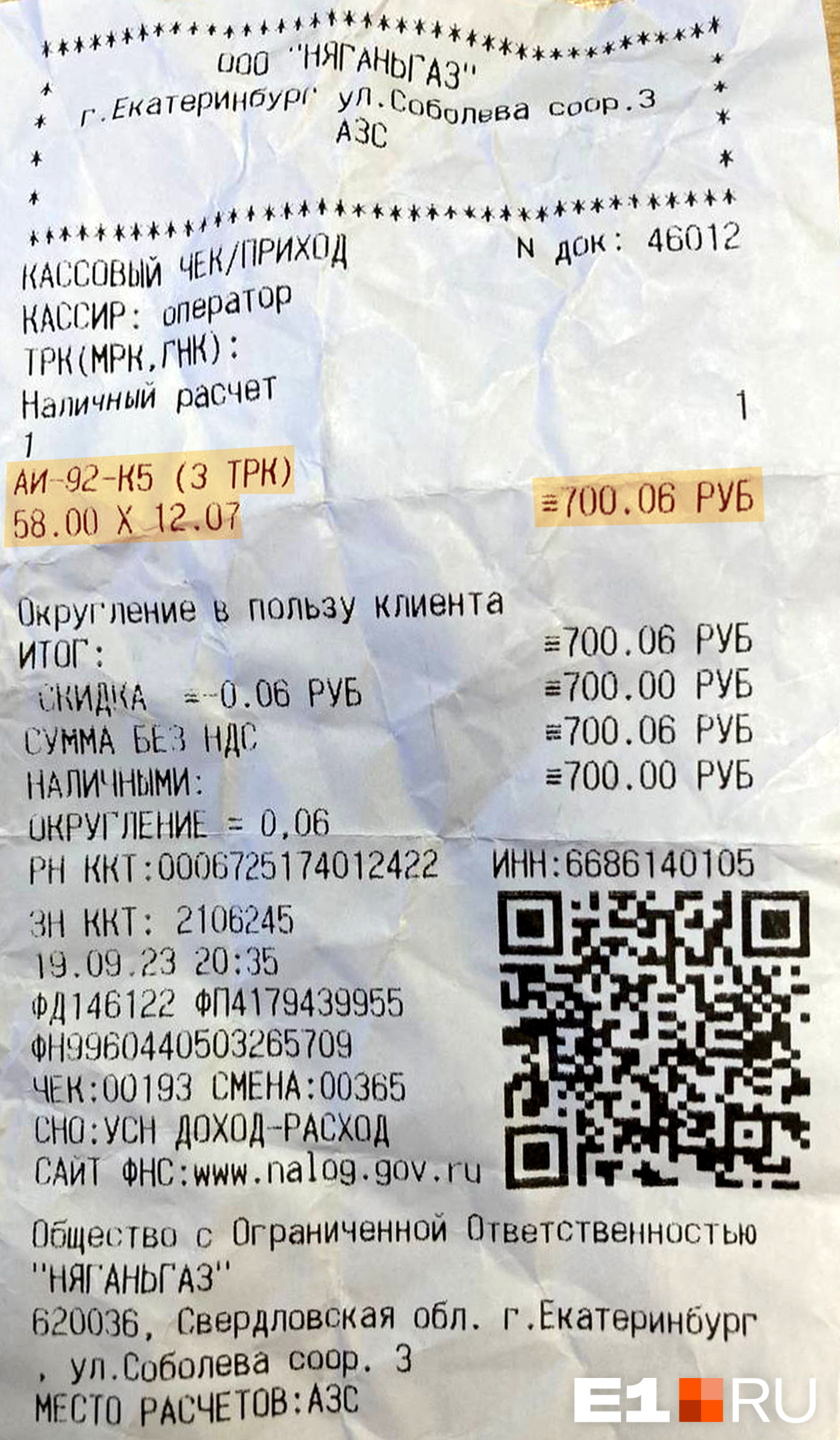 «Счастливчиком», которому пришлось отдать баснословную сумму за 92-й бензин, стал читатель E1.RU Евгений. Он прислал в редакцию фото чека от 19 сентября с АЗС «Нягань-газ» на улице Соболева.