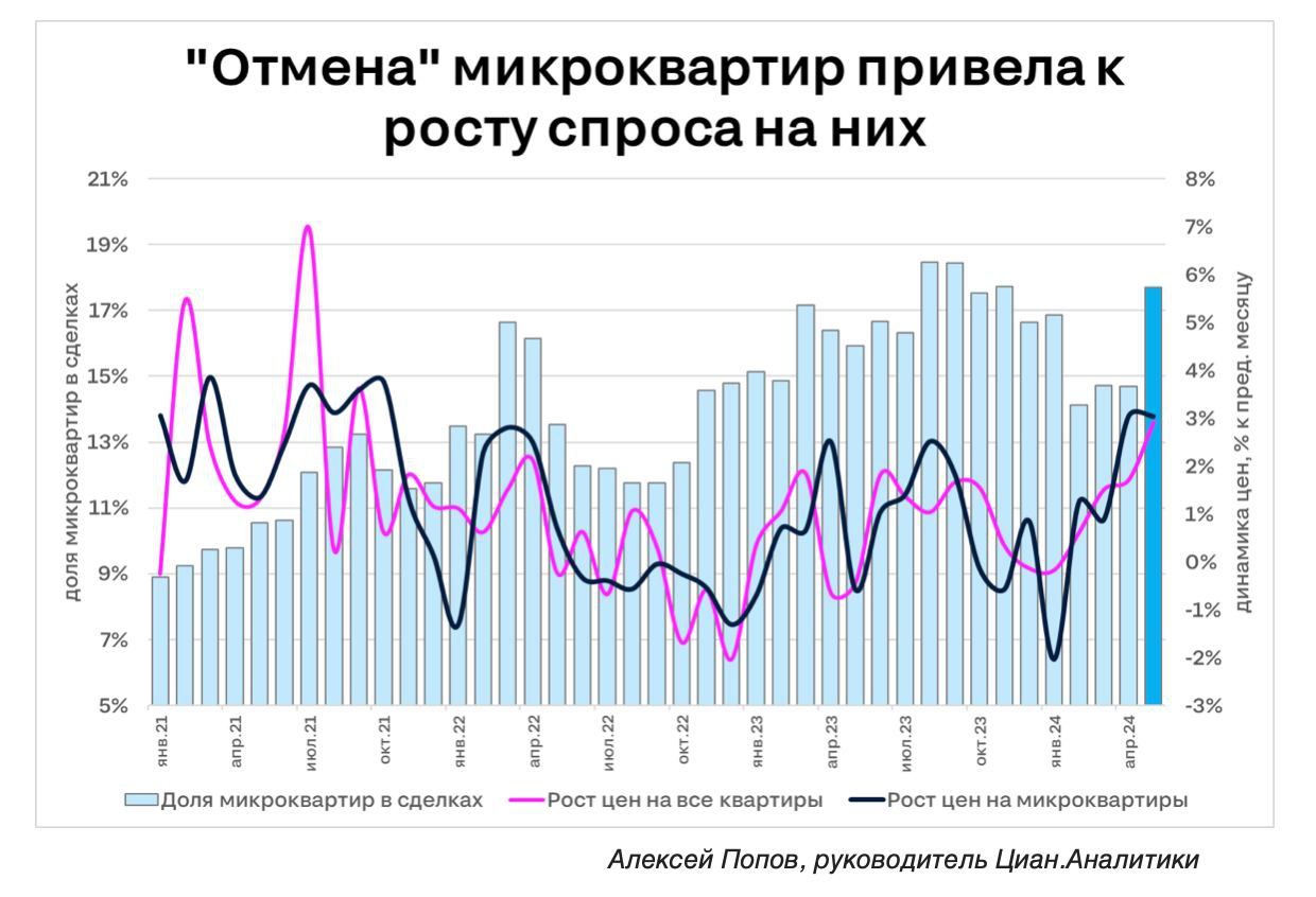 Отмена микроквартир сделала их популярными, сообщает Циан. В марте и апреле на такие сделки приходилось менее 15% от проданных лотов в Москве, в мае — уже 17,7%. Рост спроса не остановила даже индексация цен на 3%.