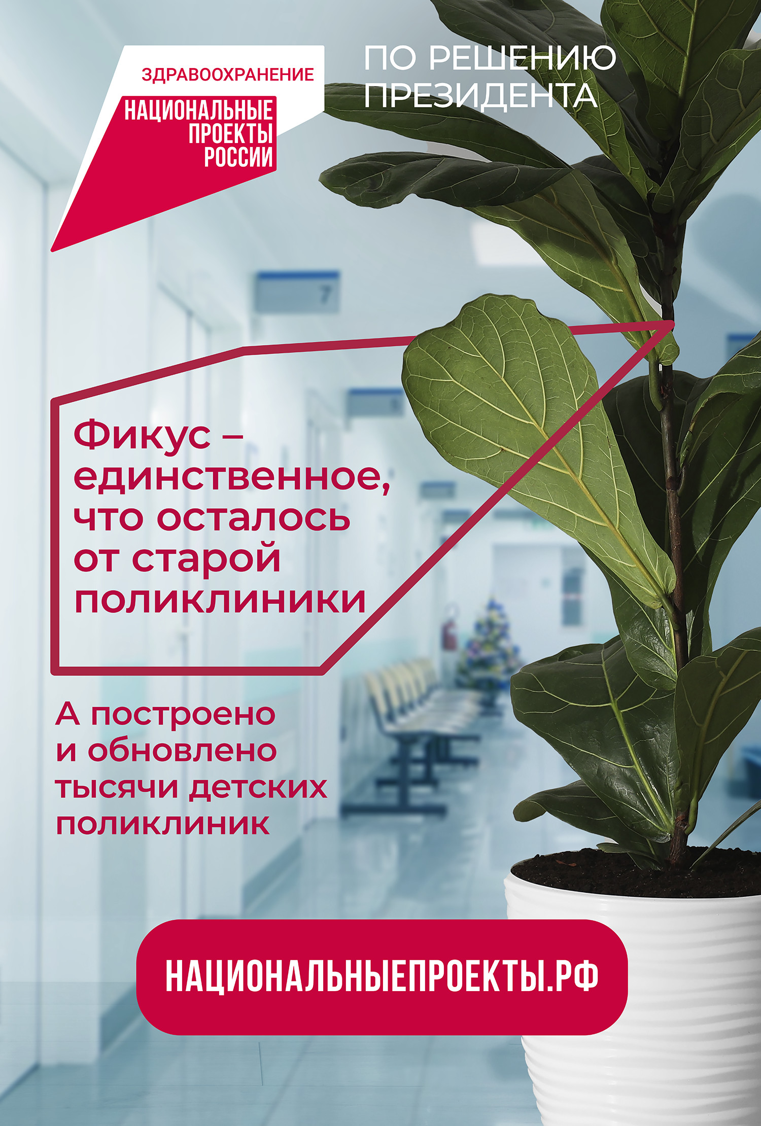 Вышла серия новых роликов о национальных проектах России — «Сделано для людей и не только». Вымышленные и настоящие герои роликов рассказывают о тех возможностях, которые стали доступны повсеместно благодаря нацпроектам. Так, в одном из сюжетов фикус, уже давно «проживающий» в детской поликлинике, показывает положительные перемены для врачей, маленьких пациентов и их родителей благодаря которым нахождение в медучреждении стало комфортным.