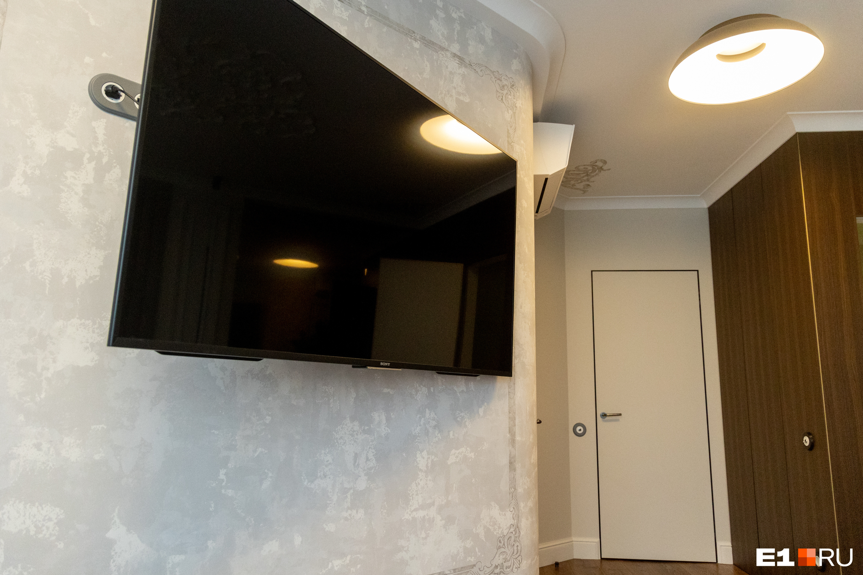 Напротив — телевизор, а дверь на заднем плане — это выход в гардеробную, в которой также есть еще одна дверь, ведущая на лестничную клетку.
