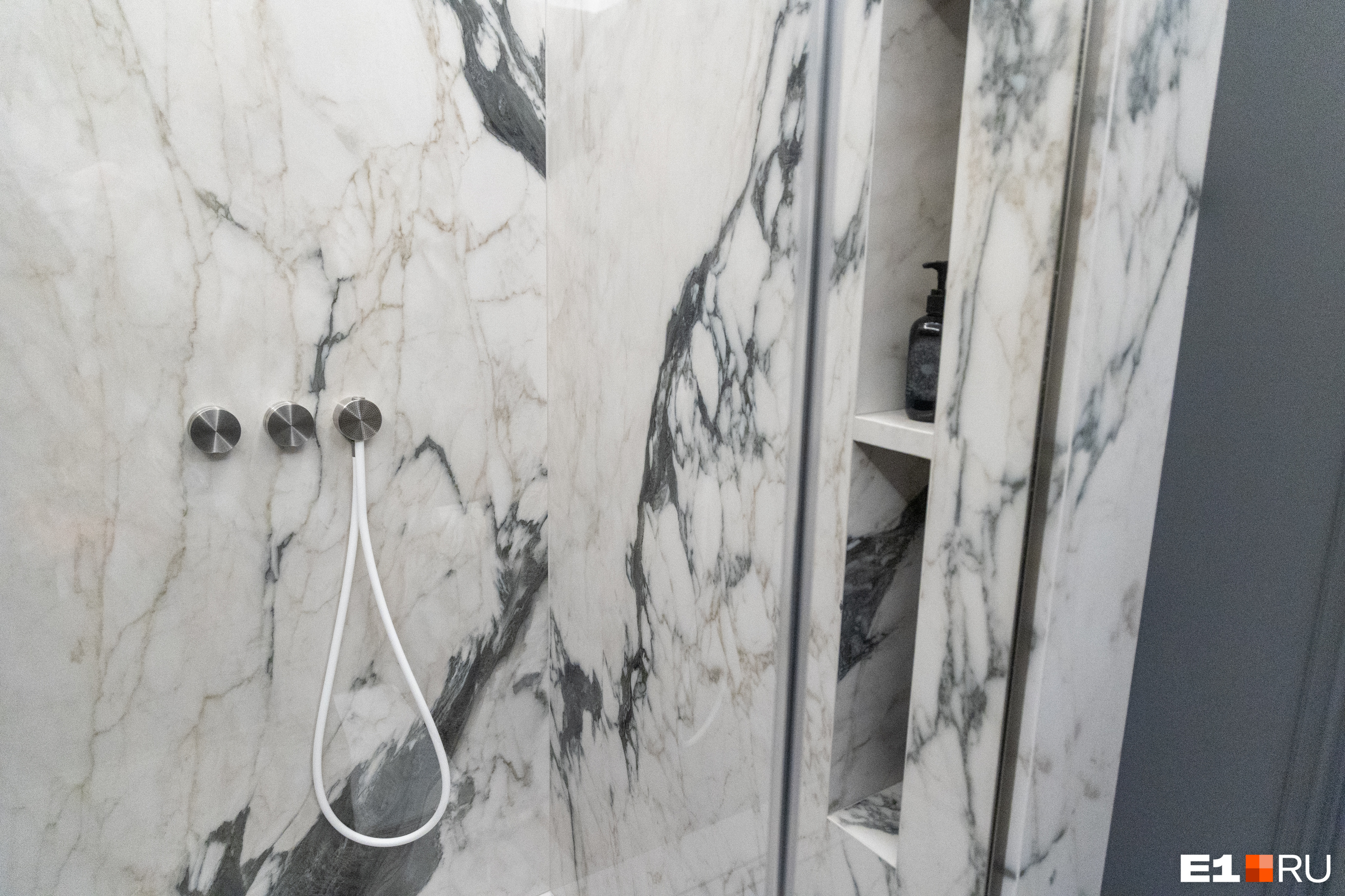Удивиться в этой небольшой комнате есть чему. Видите, чем отделана душевая? Всё это цельный гранит.
