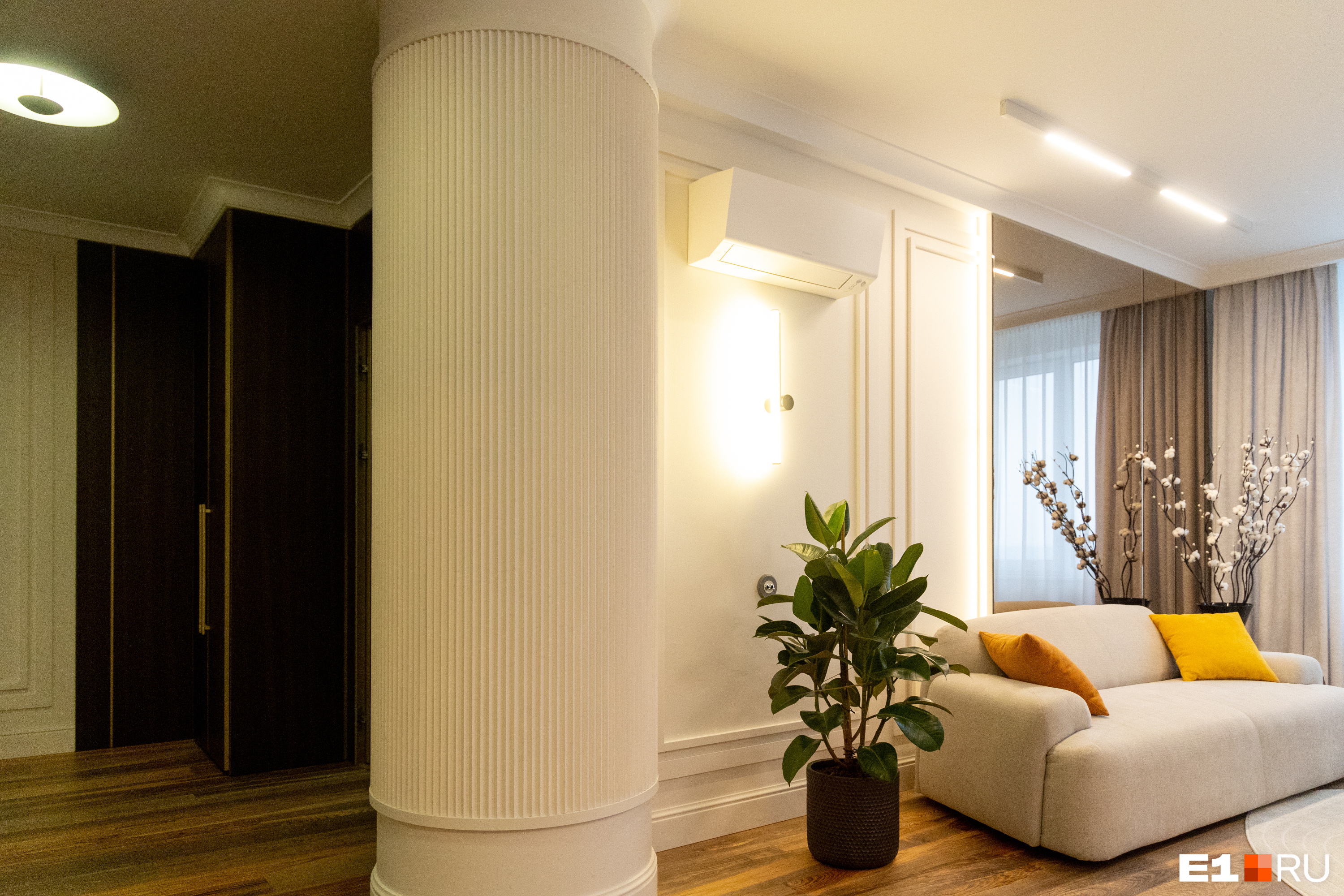Колонна посреди комнаты — не просто для красоты, она выступает несущей конструкцией. Сначала она была квадратной, но потом посмотрели на весь дизайн квартиры с изгибами и плавными линиями и решили переделать.