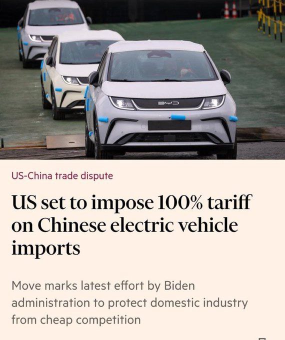 Байден предложил ввести 100% пошлины на китайские электромобили. США не выдерживают конкуренции.