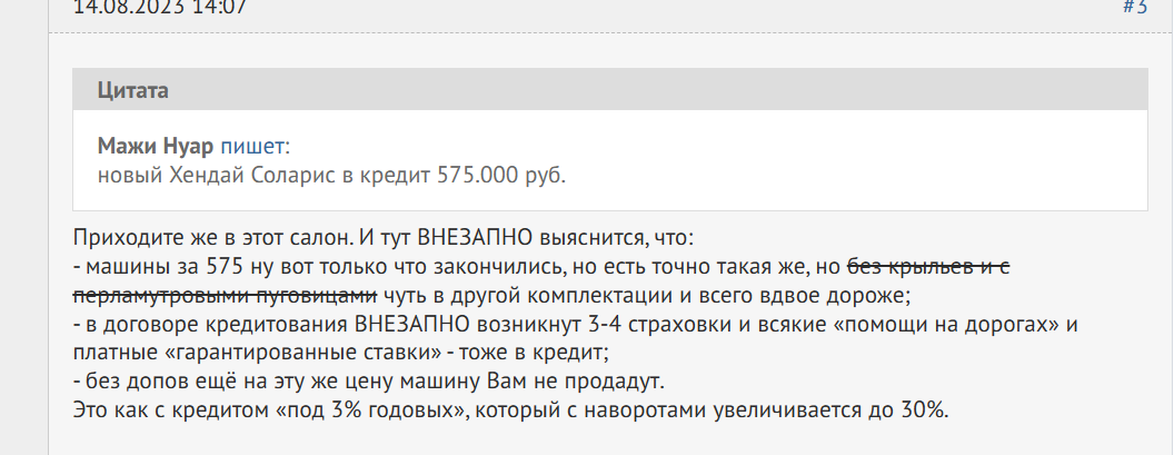 «С навязыванием допоборудования в автосалонах столкнуться по-прежнему можно, хотя и реже, чем раньше. Однако понятие допы не исчерпывается оборудованием, большое количество жалоб поступает на навязывание услуг: например, выясняется, что купить машину по привлекательно цене — „со скидкой“ — возможно только, если взять кредит или докупить „полезные“ опции. И тут уж, будьте уверены, покупателя раскрутят по полной. Связка менеджера салона и представителя банка работает очень слажено, и чтобы ей противостоять, нужны крепкие нервы и знание законов», — отмечает автоэксперт Вадим Красиков.