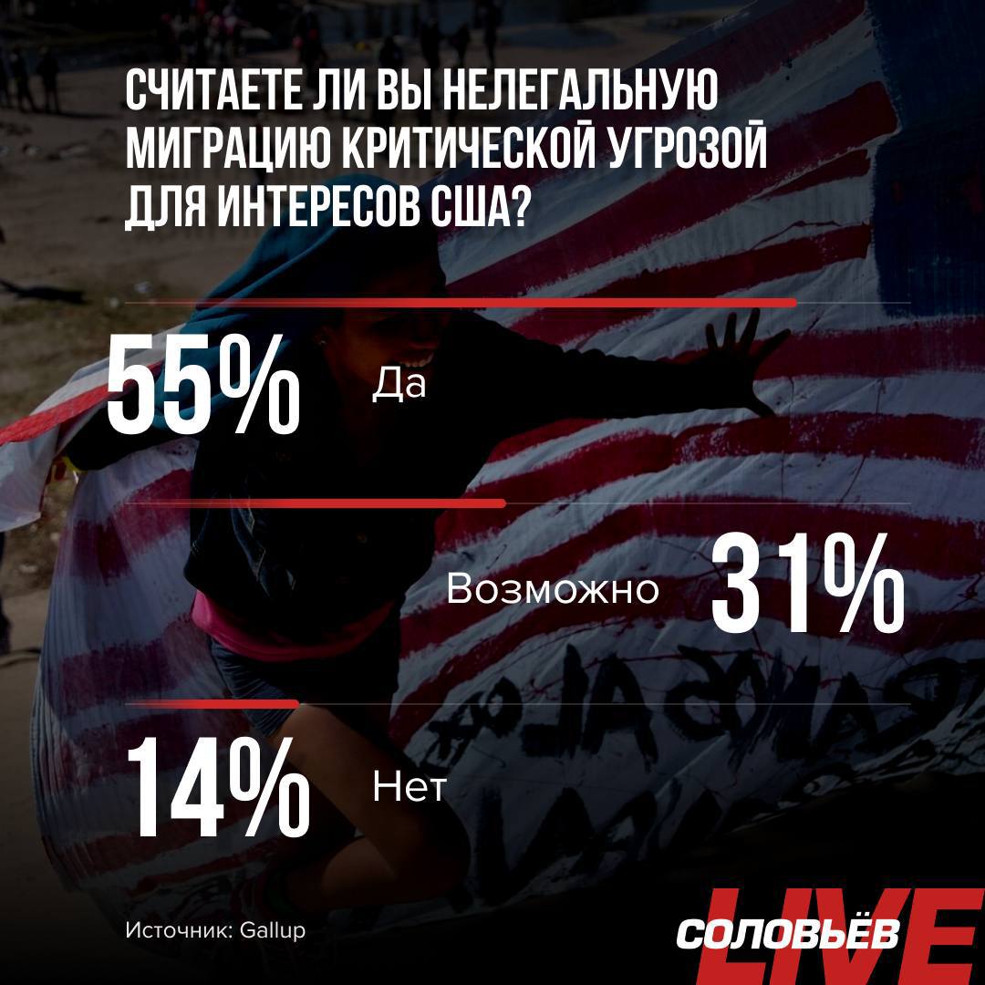 ❗️Институт Gallup провёл опрос, который показал, что более половины американцев (55%) считают нелегальную миграцию критической угрозой для интересов США.Это рекордный показатель с 2005 года.