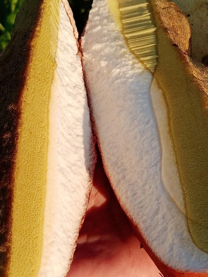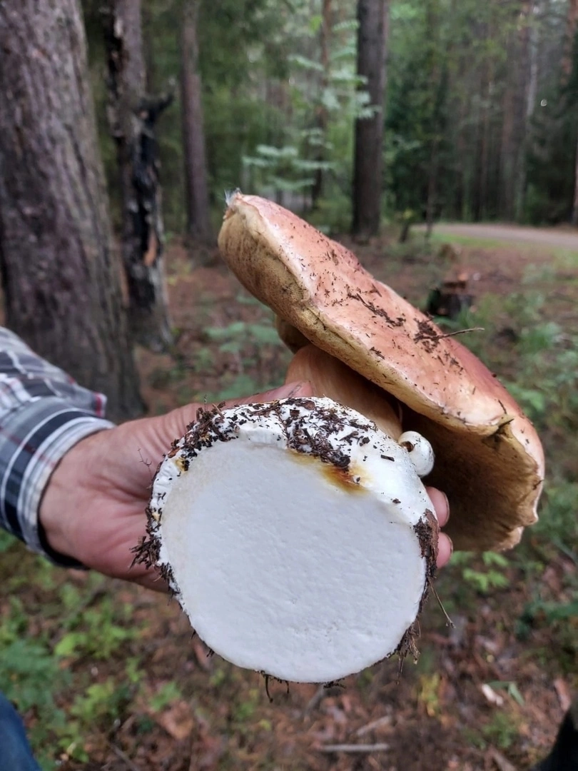 На фотографии выше — сосновый белый гриб, который срезали в районе Первоуральска в 2023 году. Его внешний вид не удивил ученого, потому что у грибов нет ограничений по размеру. А вот почему при таких объемах гриб остался чистым — загадка. Возможно, количество вредных веществ отпугивает насекомых, но это лишь догадки.