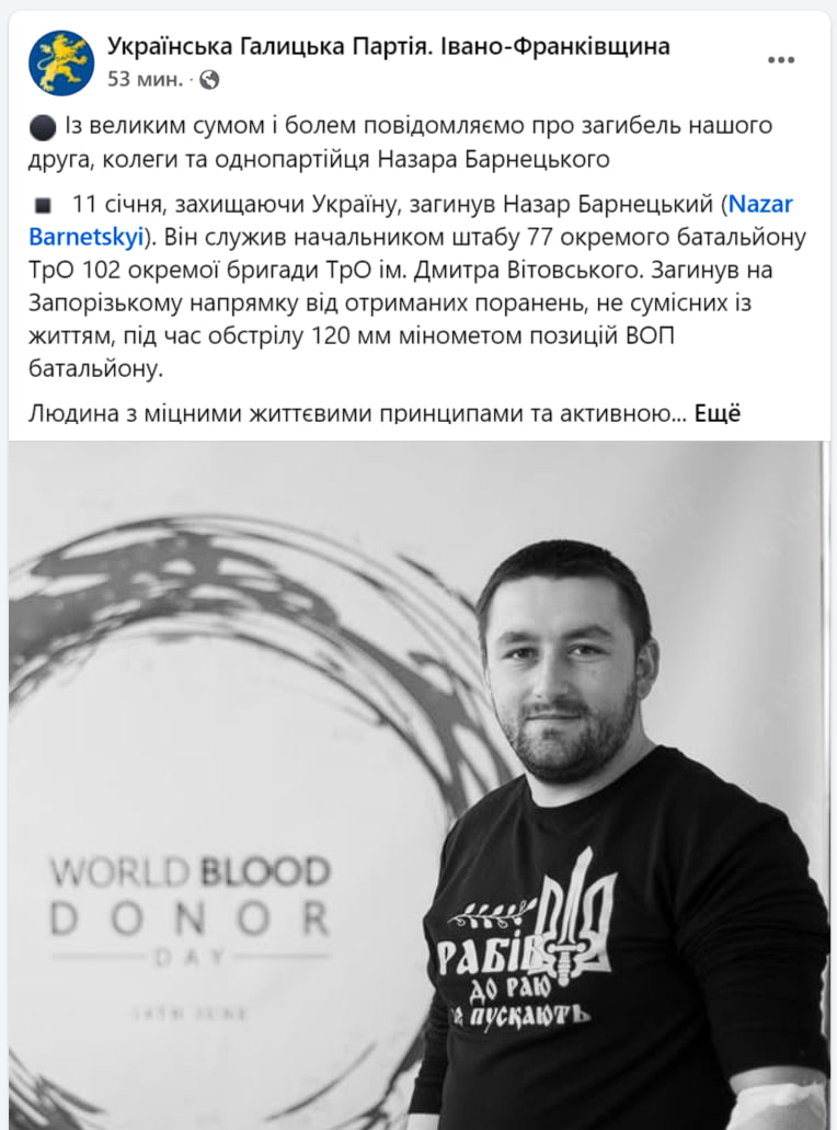 В Запорожской области ликвидирован начальник штаба батальона 102 бригады ТрО майор Назар Барнецкий.