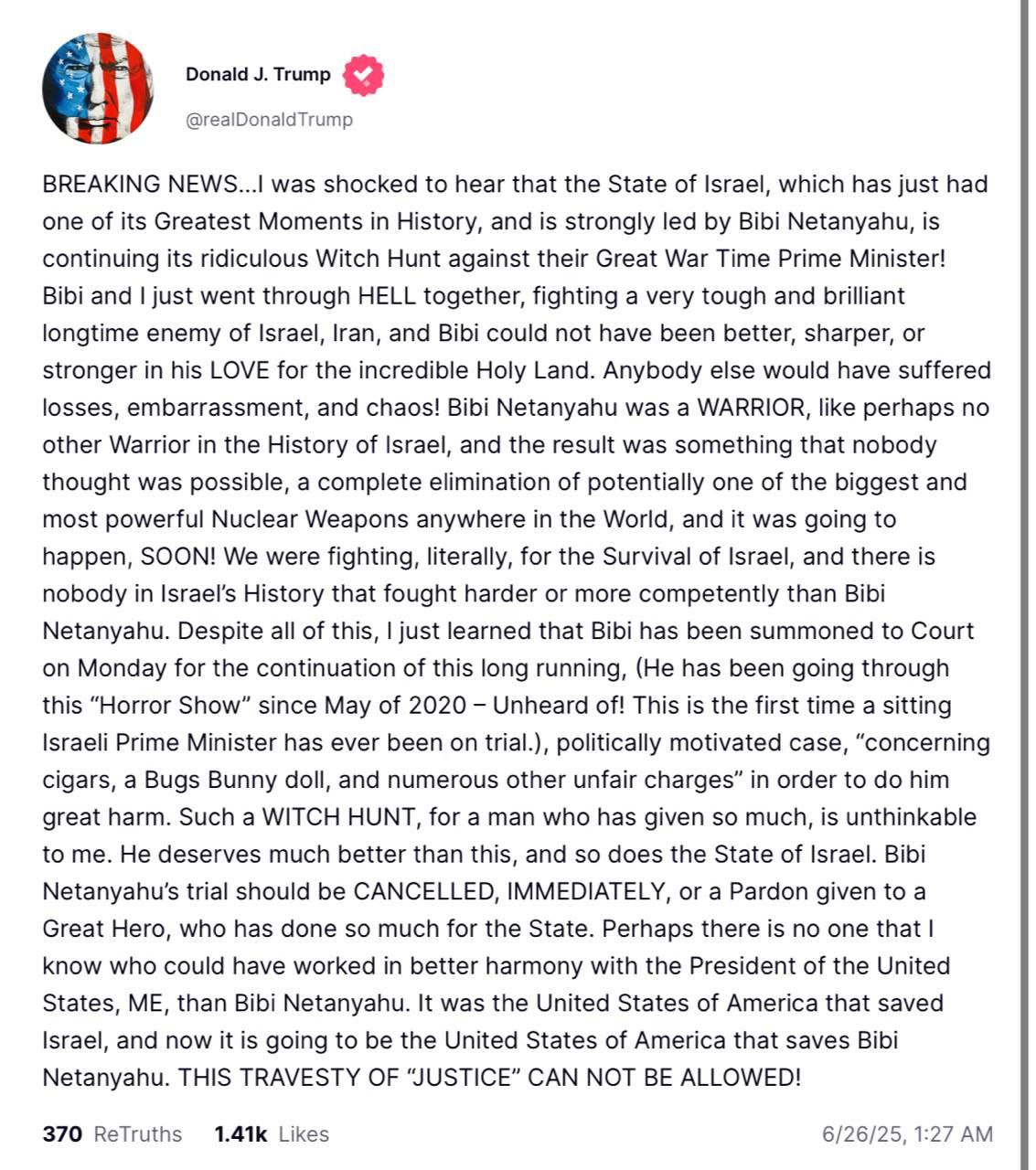 Президент США Дональд Трамп решительно осудил продолжающийся судебный процесс над премьер-министром Израиля Биньямином Нетаньяху, назвав его политически мотивированной «пародией на правосудие»