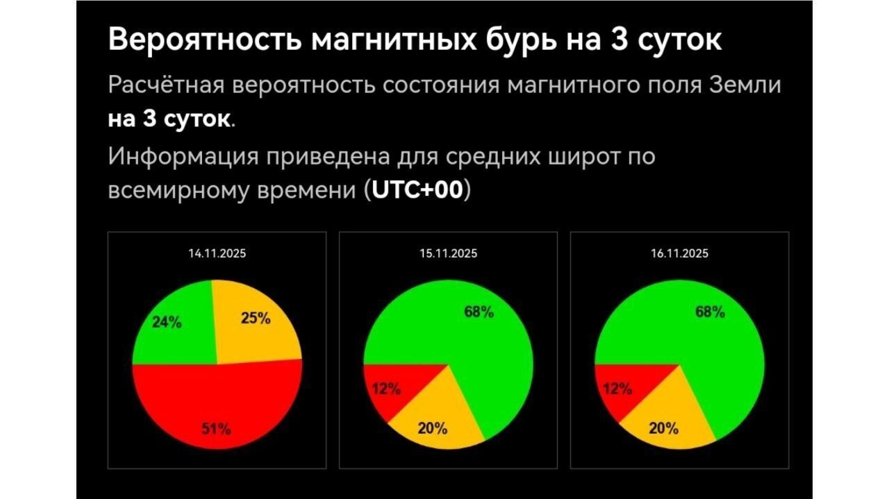Вероятность шторма 15 ноября — 12%, перехода магнитосферы в возбужденное состояние — 20%. О магнитных бурях до конца ноября мы рассказывали здесь.