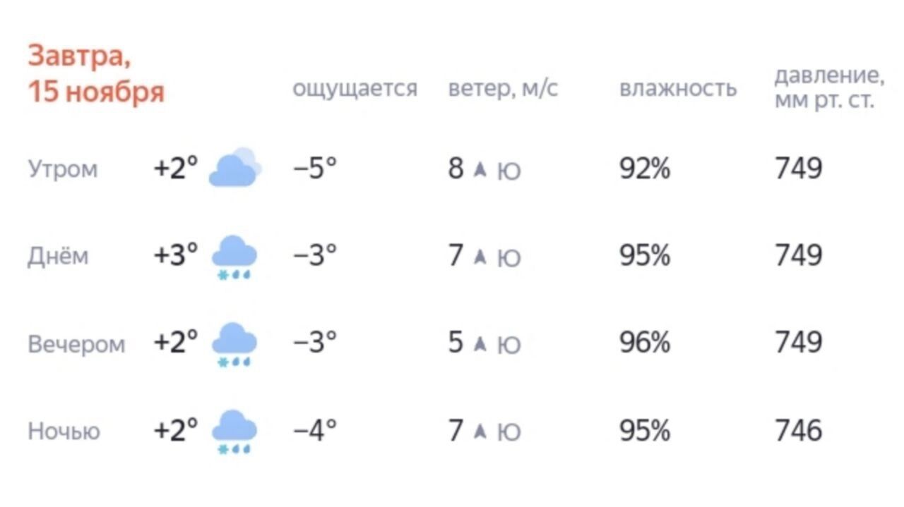 В субботу, 15 ноября, средняя температура в Югре составит от -2 до +3 градусов днем, и от 0 до -5 градусов — ночью. На западе днем возможно похолодание до -10 градусов. Также прогнозируют мокрый снег и дождь, возможно налипание снега. Ветер — юго-восточный с переходом в южный, 9-14 м/с.