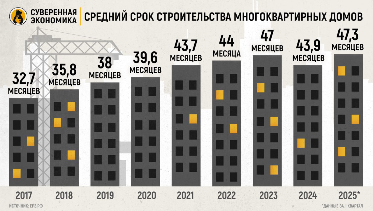 🏗 Дома стали строиться на 1,5 года дольше — высотки, сложные проекты и отсутствие штрафов В I квартале этого года средний срок строительства многоквартирных домов (МКД) достиг 47,3 месяцев, следует из данных Единого ресурса застройщиков. С 2017 этот показатель вырос почти в 1,5 раза. Главная причина довольно проста — дома стали больше. За этот период средняя этажность МКД выросла с 15-16 до 19. Вслед за этим увеличился и метраж. Начала расти и сложность проектов. К примеру, в Москве почти нет типового строительства, девелоперы должны предлагать оригинальный дизайн, который впишется в обстановку. Используемые материалы также становятся более сложными и технологичными. При этом становится больше случаев срыва срока ввода МКД в эксплуатацию. В I квартале 2025 почти половину домов сдали с опозданием. Немаловажным фактором здесь стал мораторий на штрафы за срыв сроков, который действует до 30 июня. Хотя застройщики, конечно, указывают на дефицит кадров, долгое подключение к инженерным сетям, санкции и так далее. Государство, в свою очередь, наоборот, пытается ускорить сдачу домов с помощью сокращения бюрократии. В отрасли отмечают, что регулирование действительно стало более гибким. Но общую картину это пока не спасает.