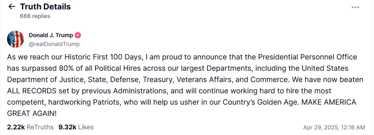 «По мере того как мы достигаем исторических первых 100 дней, я с гордостью сообщаю, что Управление по работе с персоналом президента превысило 80% всех политических наймов в наших крупнейших министерствах, включая Министерство юстиции США, Государство, Министерство обороны, Казначейство, Министерство по делам ветеранов и Министерство торговли. Мы побили все рекорды, установленные предыдущими администрациями, и будем продолжать упорно работать, чтобы нанять самых компетентных, трудолюбивых патриотов, которые помогут нам начать Золотой век нашей страны. СДЕЛАЕМ АМЕРИКУ СНОВА ВЕЛИКОЙ!»