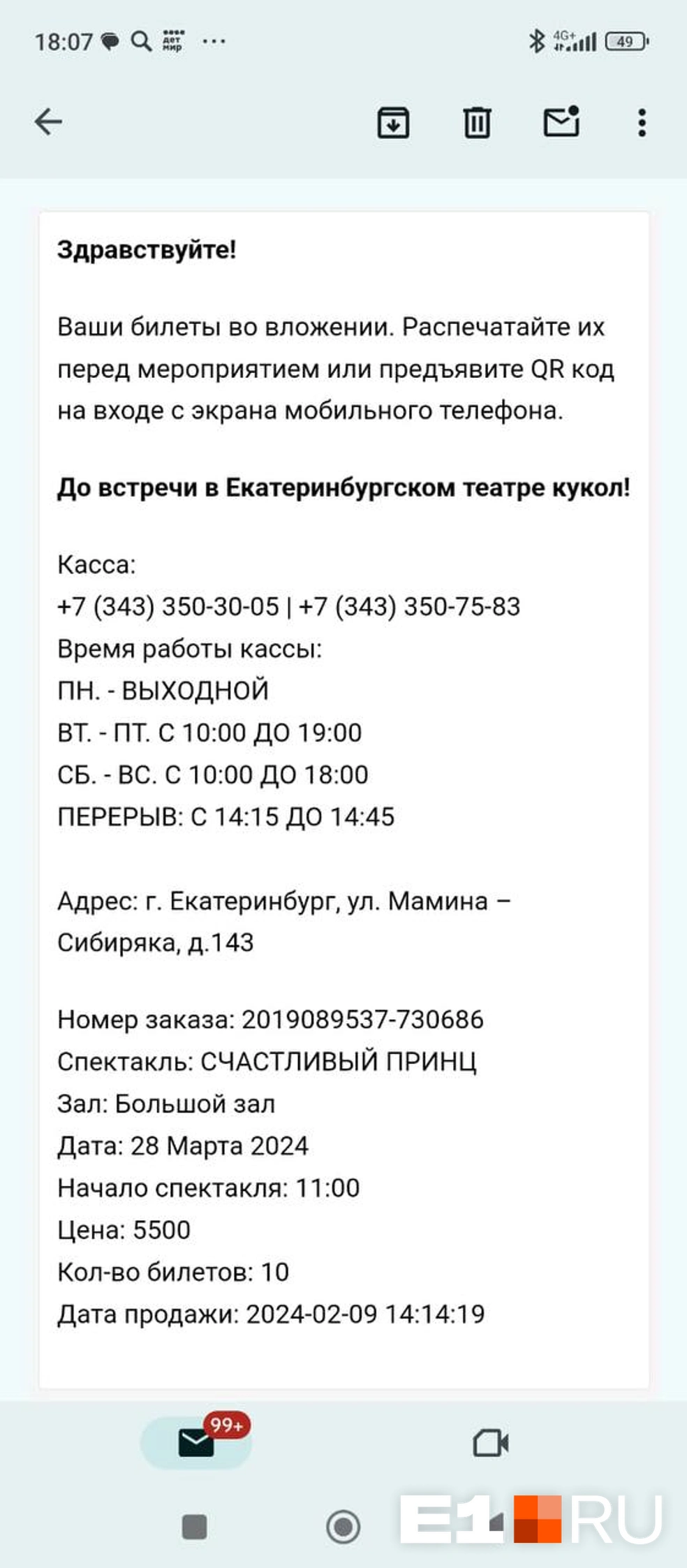 Екатеринбургский театр кукол отказался возвращать деньги за билеты родителям школьников, которые собирались 28 марта пойти на спектакль. Однако побоялись посещать массовые мероприятия после теракта в подмосковном «Крокусе». Об этом нам рассказала читательница E1.RU.