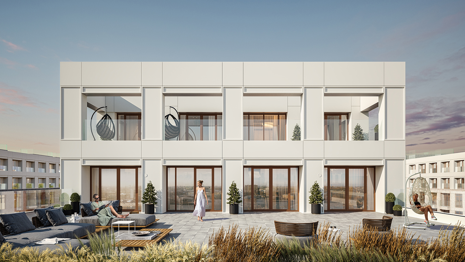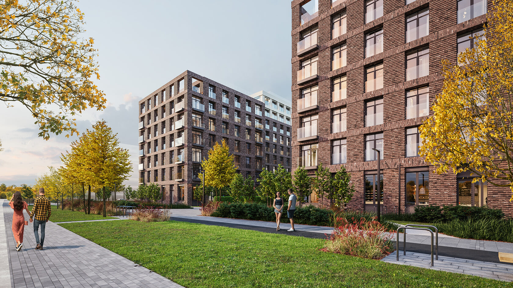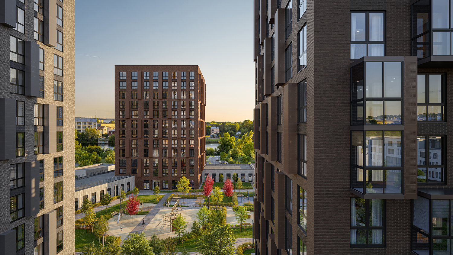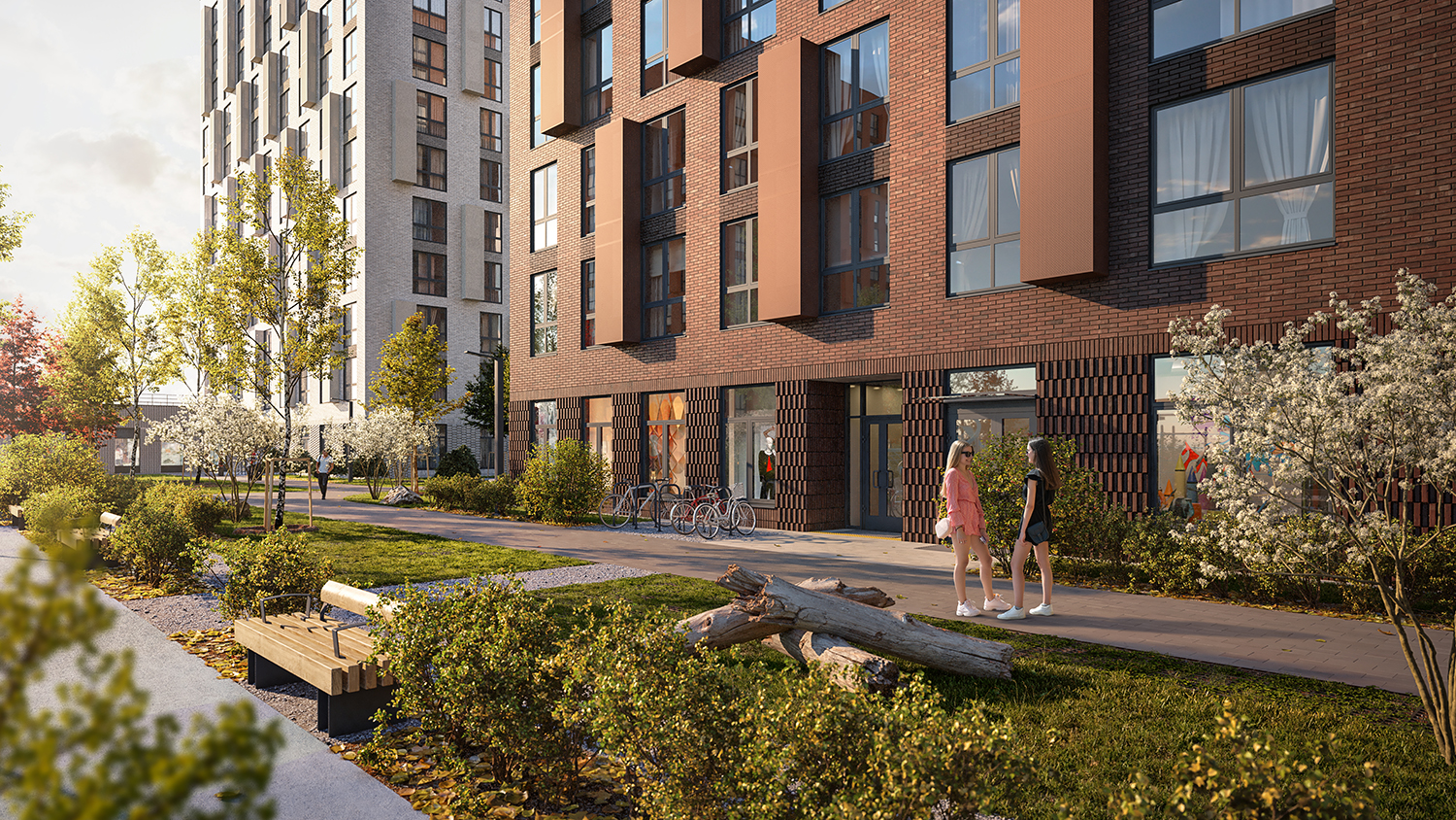 У каждого квартала уникальный облик. Здания выглядят монументально и в то же время лаконично — их прямоугольные объемы аккуратно встраиваются в архитектурный контекст места. Выразительности фасадам придают невесомые прозрачные ограждения открытых балконов или динамичное чередование застекленных; террасы на верхних этажах или патио на первых. Последние предусмотрены, например, для нескольких квартир проекта «Лермонтовский 54». Каждый приватный дворик окружат живой изгородью и аккуратным забором. Здесь можно будет поставить столик и кресла, чтобы отдыхать на свежем воздухе.