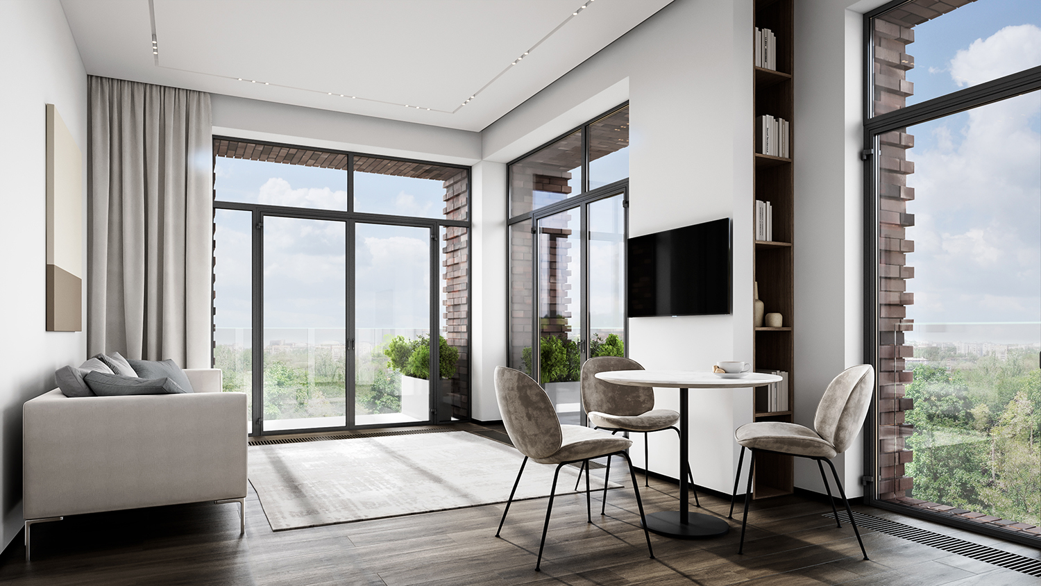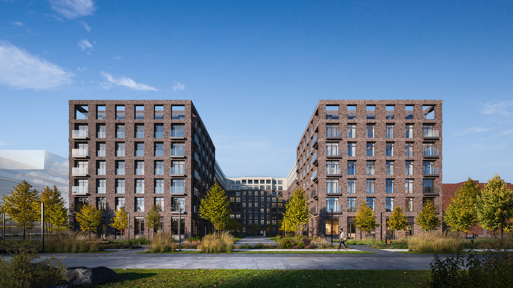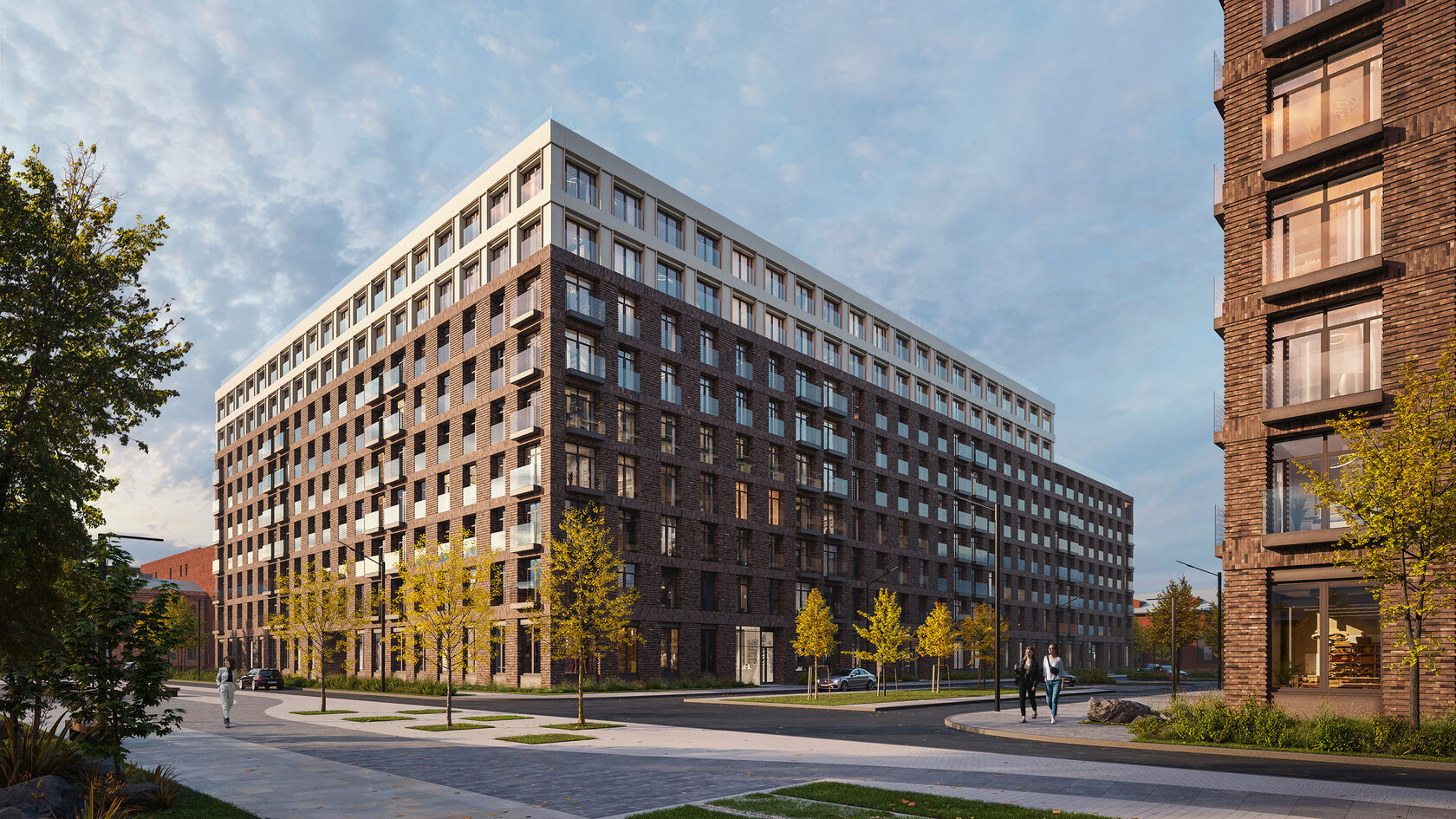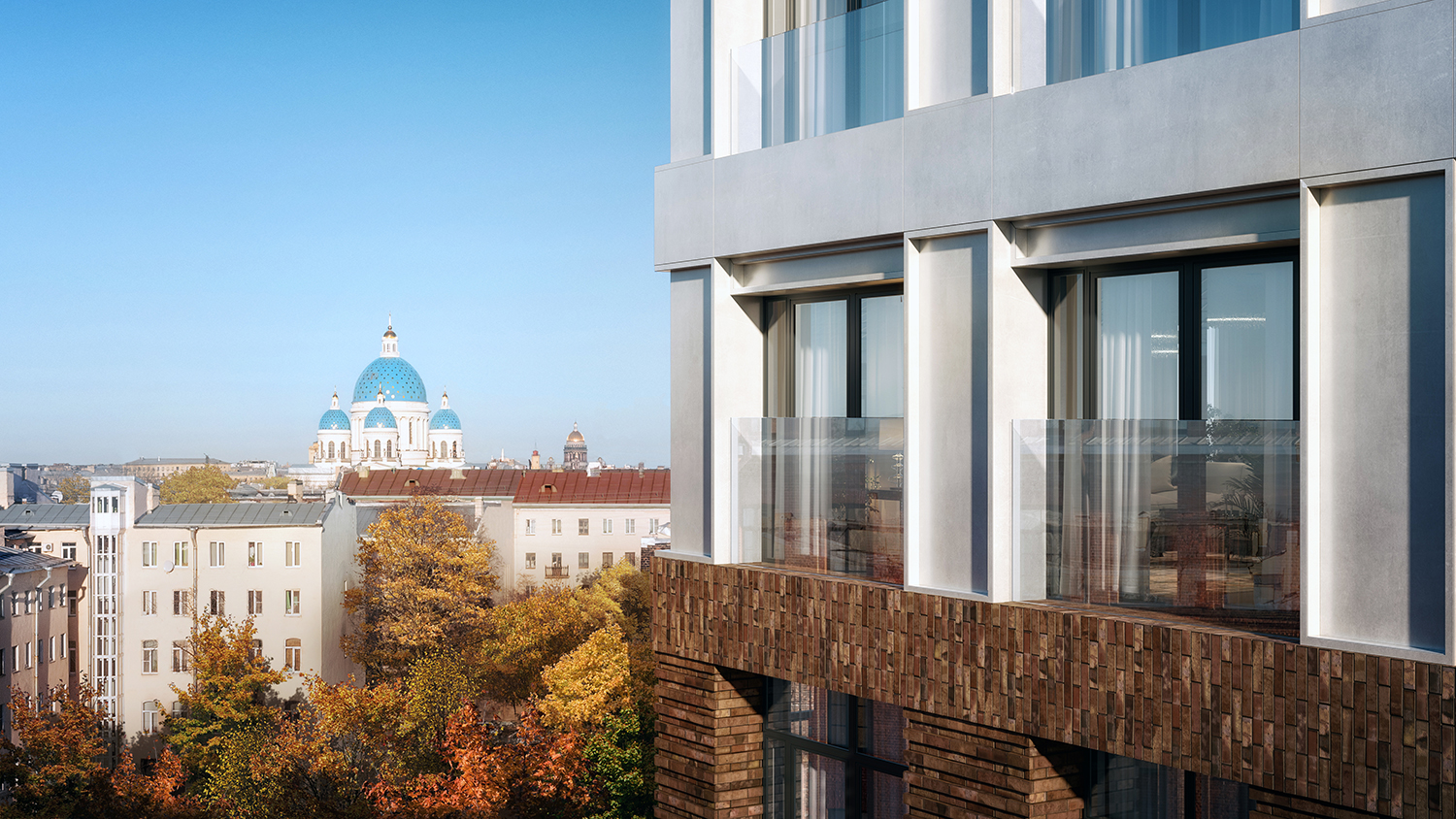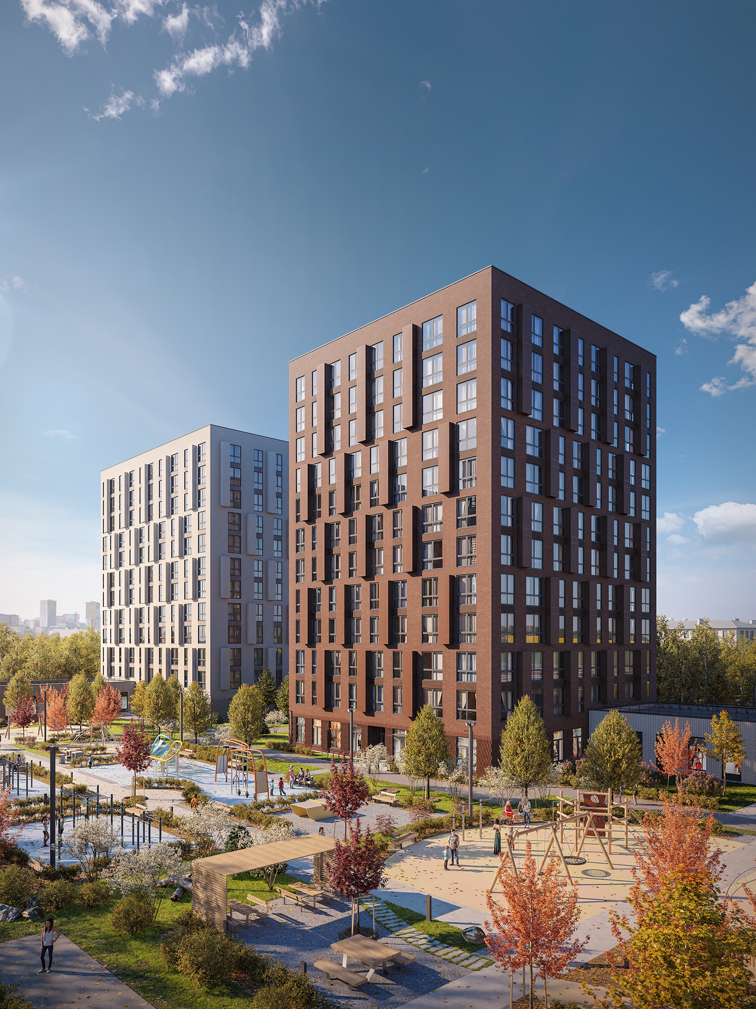 У каждого квартала уникальный облик. Здания выглядят монументально и в то же время лаконично — их прямоугольные объемы аккуратно встраиваются в архитектурный контекст места. Выразительности фасадам придают невесомые прозрачные ограждения открытых балконов или динамичное чередование застекленных; террасы на верхних этажах или патио на первых. Последние предусмотрены, например, для нескольких квартир проекта «Лермонтовский 54». Каждый приватный дворик окружат живой изгородью и аккуратным забором. Здесь можно будет поставить столик и кресла, чтобы отдыхать на свежем воздухе.