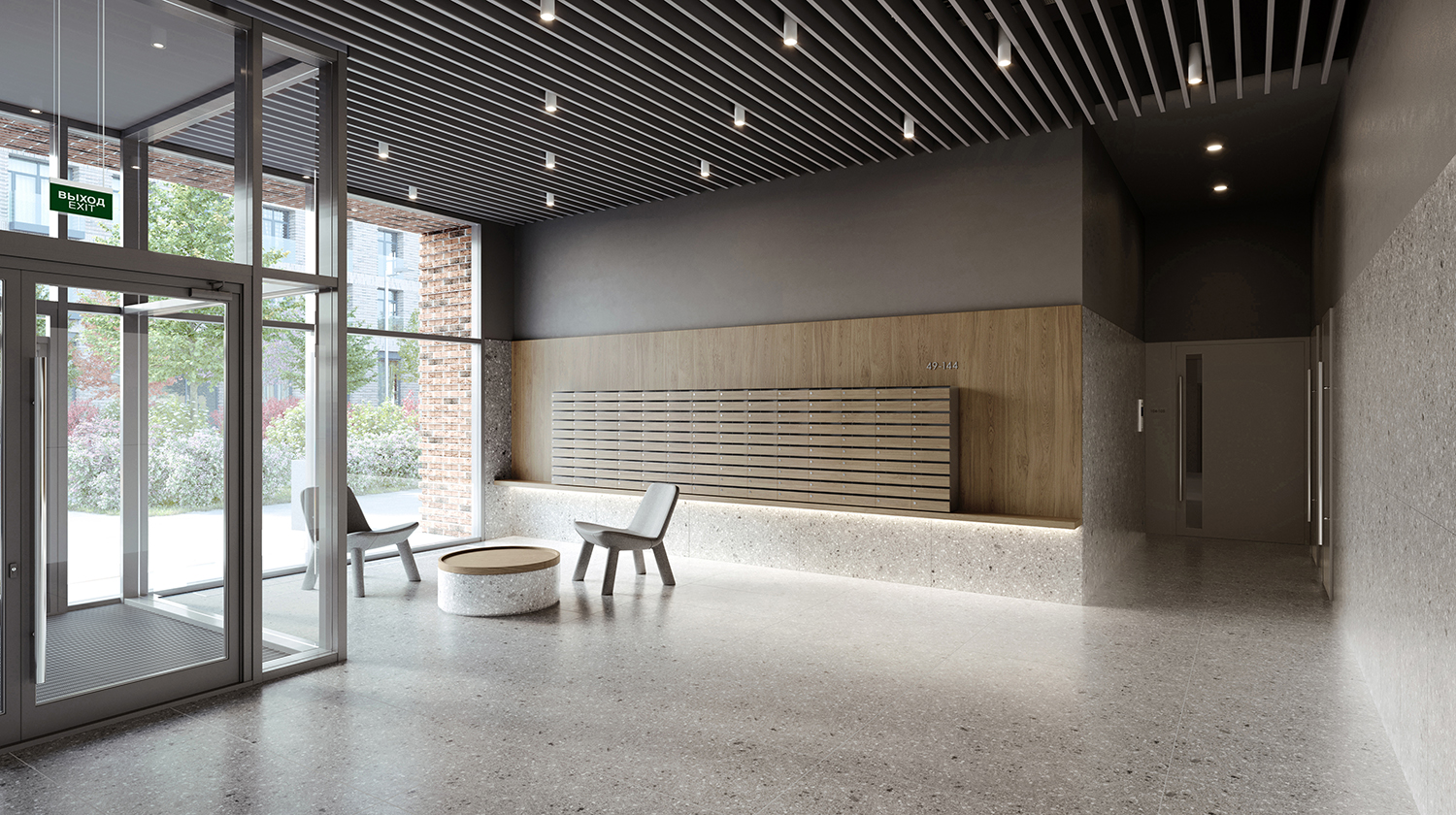 В домах «Серии плюс» предусмотрены лобби, выполненные по специальному дизайн-проекту. Их отличают высокие потолки, стеклянные двери и вход на уровне земли. Для гостей и курьеров устроена удобная зона ожидания. В большинстве лобби есть помещения, где можно оставлять коляски, велосипеды и самокаты. Домашних любимцев ждут лапомойки: хозяева смогут не только привести собак в порядок после прогулки, но и помыть целиком.