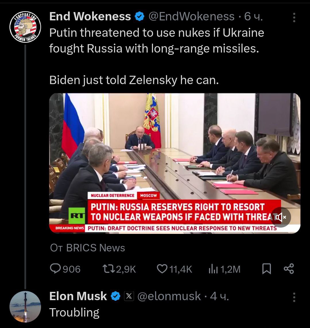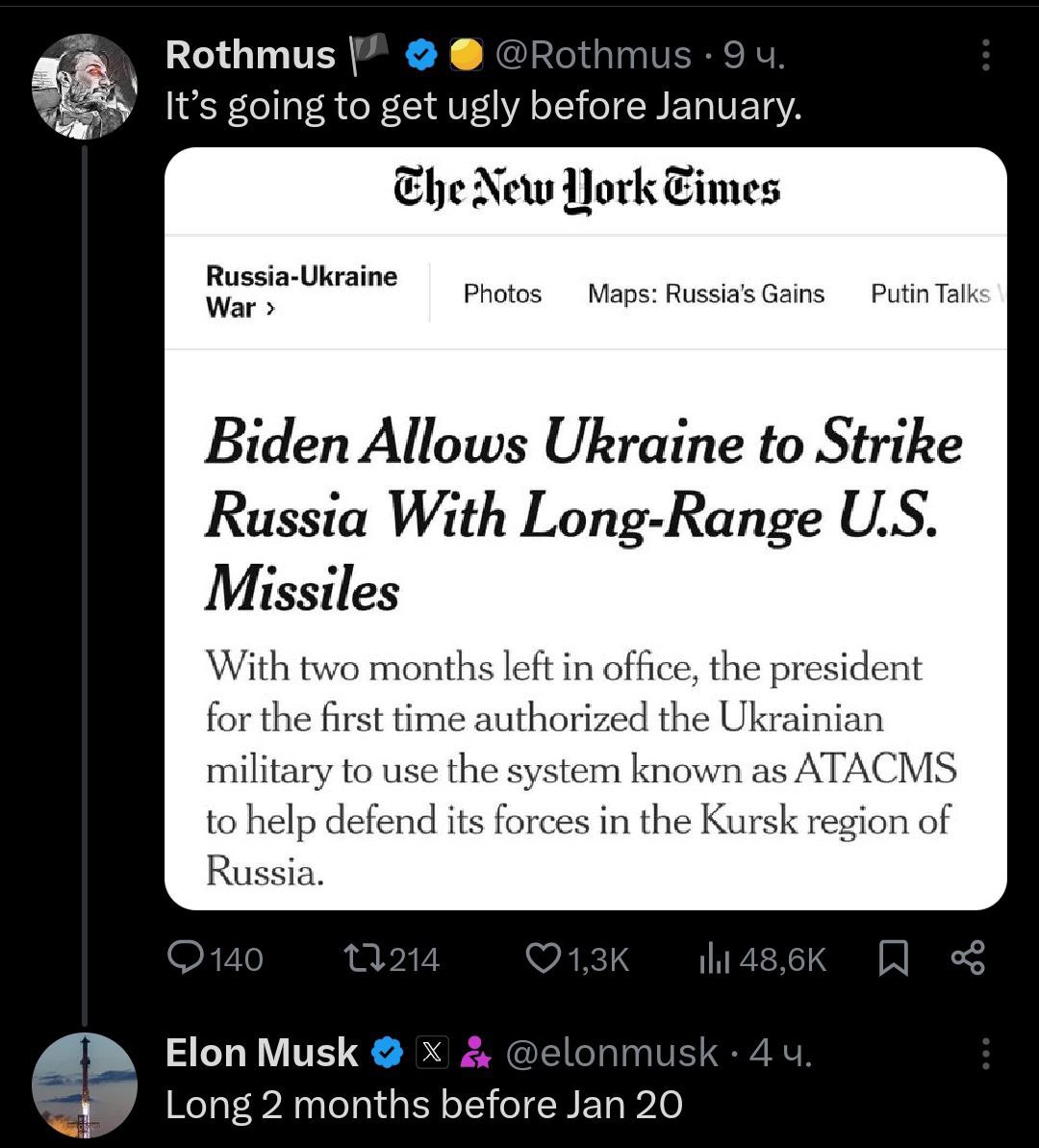Новая порция критических комментариев Илона Маска по поводу разрешения Байдена бить по России дальнобойными ракетами.