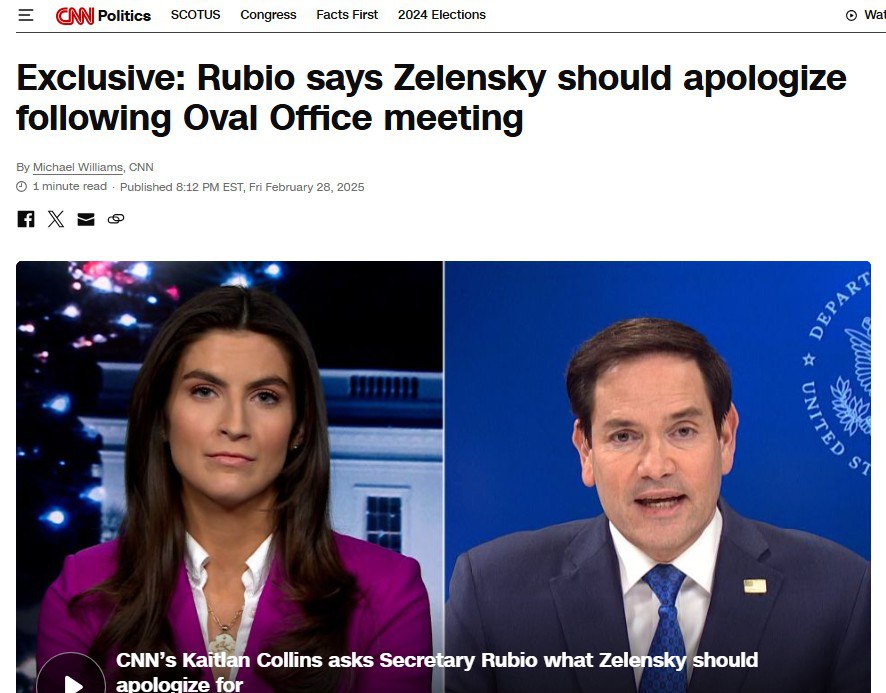 «Возможно, Зеленский не хочет мирного соглашения. Он говорит, что хочет, но, возможно, это не так», – добавил Рубио в интервью CNN.