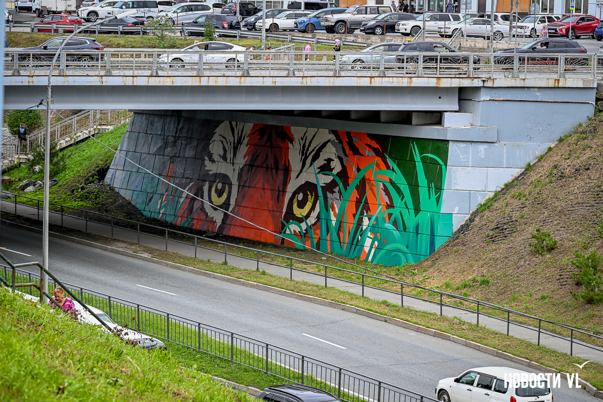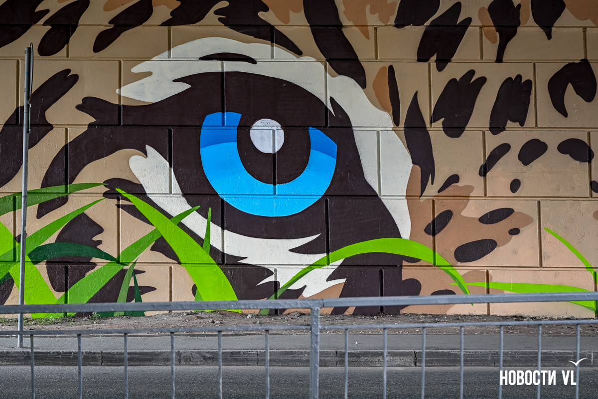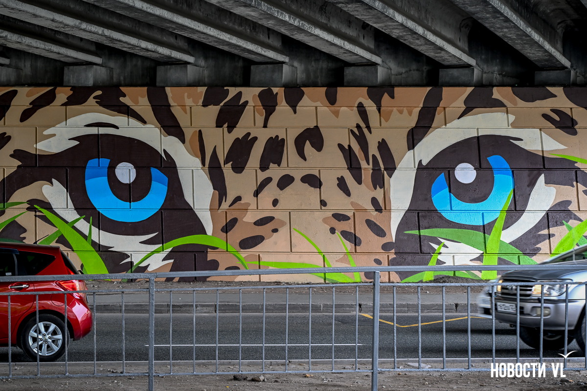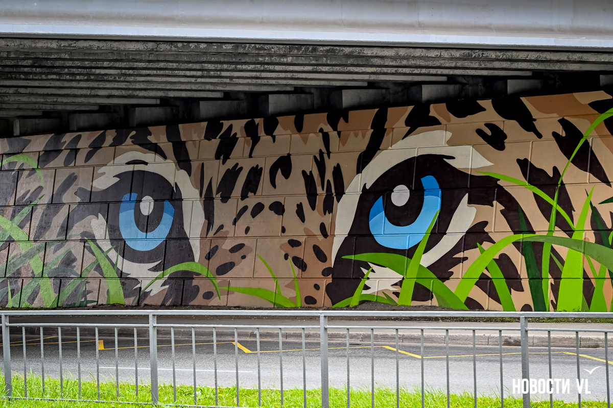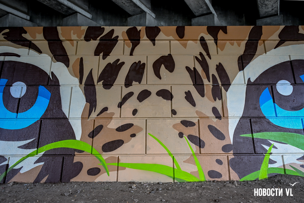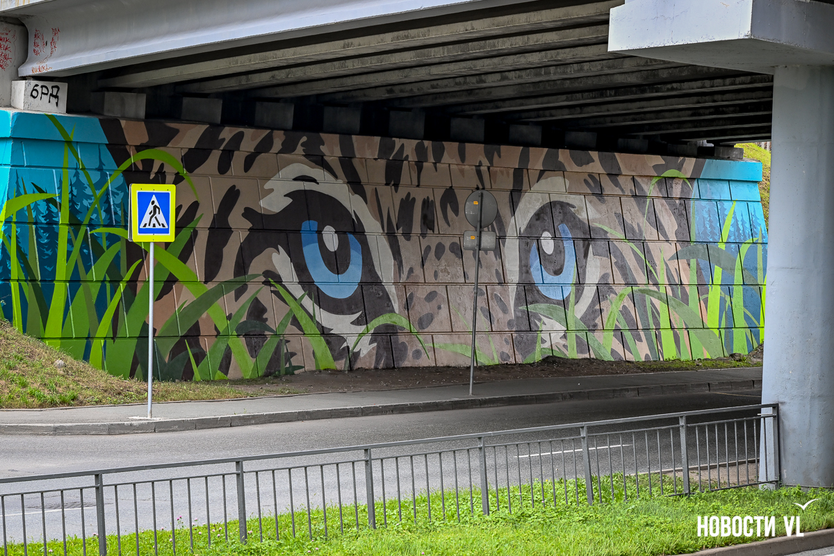 Несколько дней назад владивостокские художники закончили роспись стен под мостом путепровода на Окатовой. Теперь с противоположных сторон дороги на людей и друг на друга смотрят тигр и леопард. Изображения хищников здесь появились благодаря проведённому управлением молодёжи конкурсу муралов.