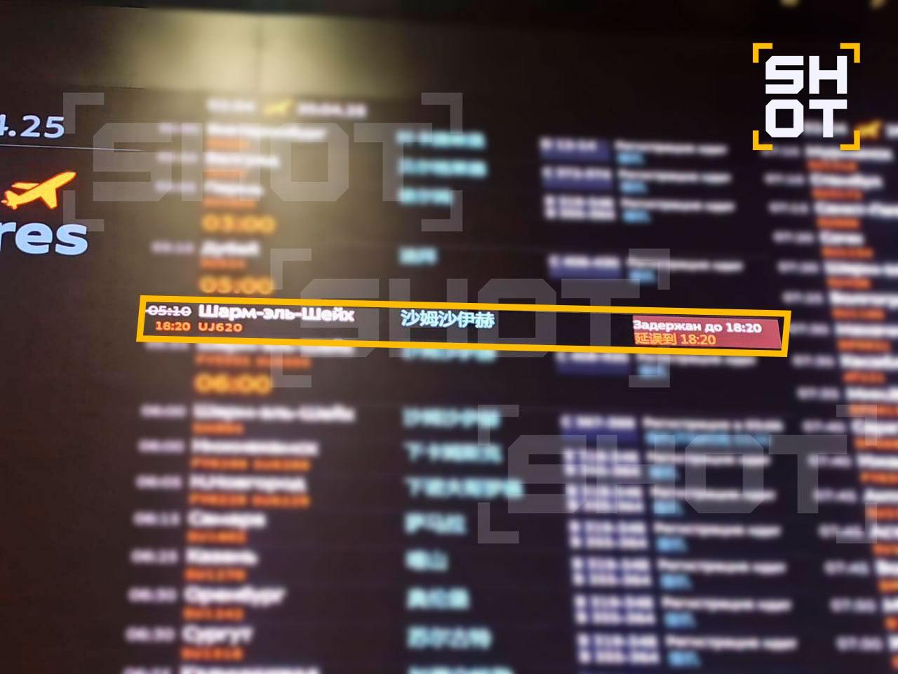 По данным SHOT, пассажиры рейса UJ620 должны были отправиться в Шарм-эль-Шейх ещё в 5 утра, однако вылет перенесли сначала на 13 часов — до 18:20, а затем на ещё на 3 часа — до 21:40.