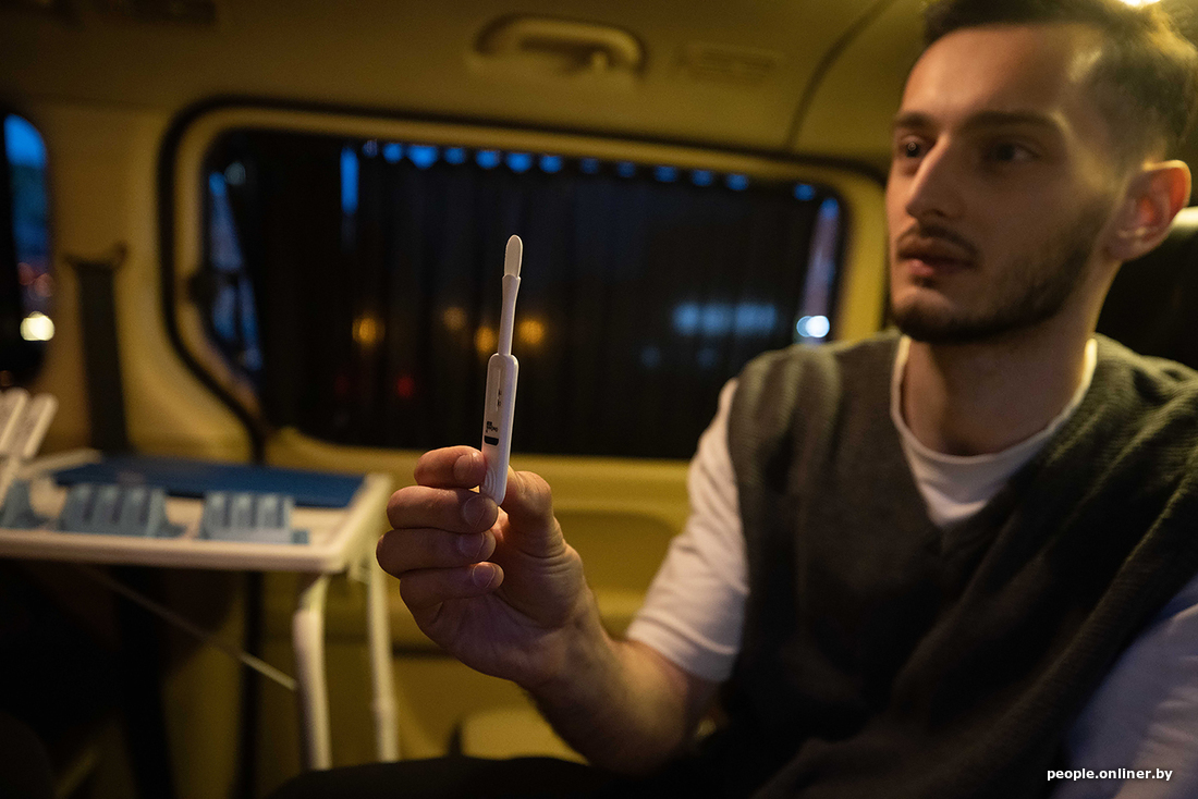 Пока мы разговаривали со Стасом, ребята успели протестировать девушку-промоутера из соседнего бара, а теперь к нам подошли еще два парня — работа идет. Внутри бусика людей встречают Даня и Алина — еще два сотрудника проекта. Они проводят анонимное анкетирование и помогают сделать анализ. А делается он суперпросто: провел палочкой-тестером между десной и губой, поставил в пробирку с раствором и ждешь. А вообще, можешь не ждать — иди тусуйся дальше, а результат придет завтра эсэмэской.