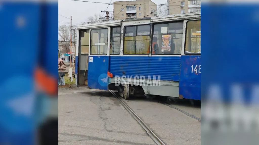 На видеозаписях видно, что колеса трамвая сошли с рельсов и остановились поперек пути.