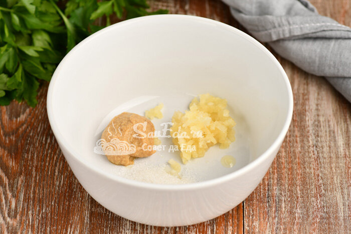 1. В миску высыпаем сахар, добавляем горчицу и пропущенный через пресс чеснок.
