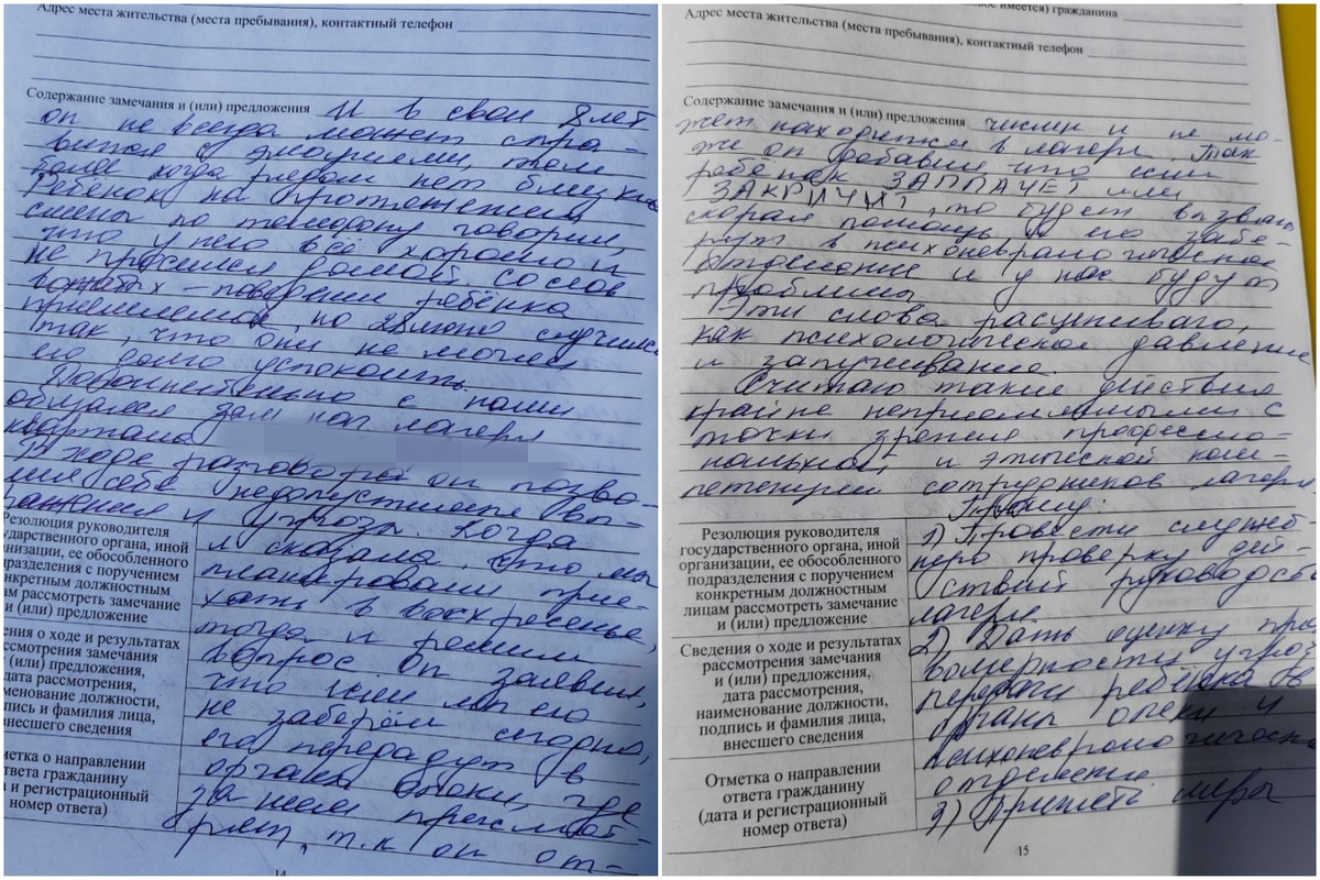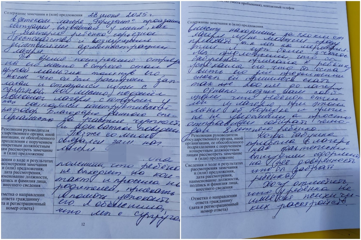 На 10-й день смены (это было 28 июня) случилась ситуация, после которой Марина не только оставила претензию в книге замечаний и предложений, но и написала обращение в Министерство образования. Мы рассказываем о событиях только со слов мамы, потому что в лагере отказались делиться подробностями.