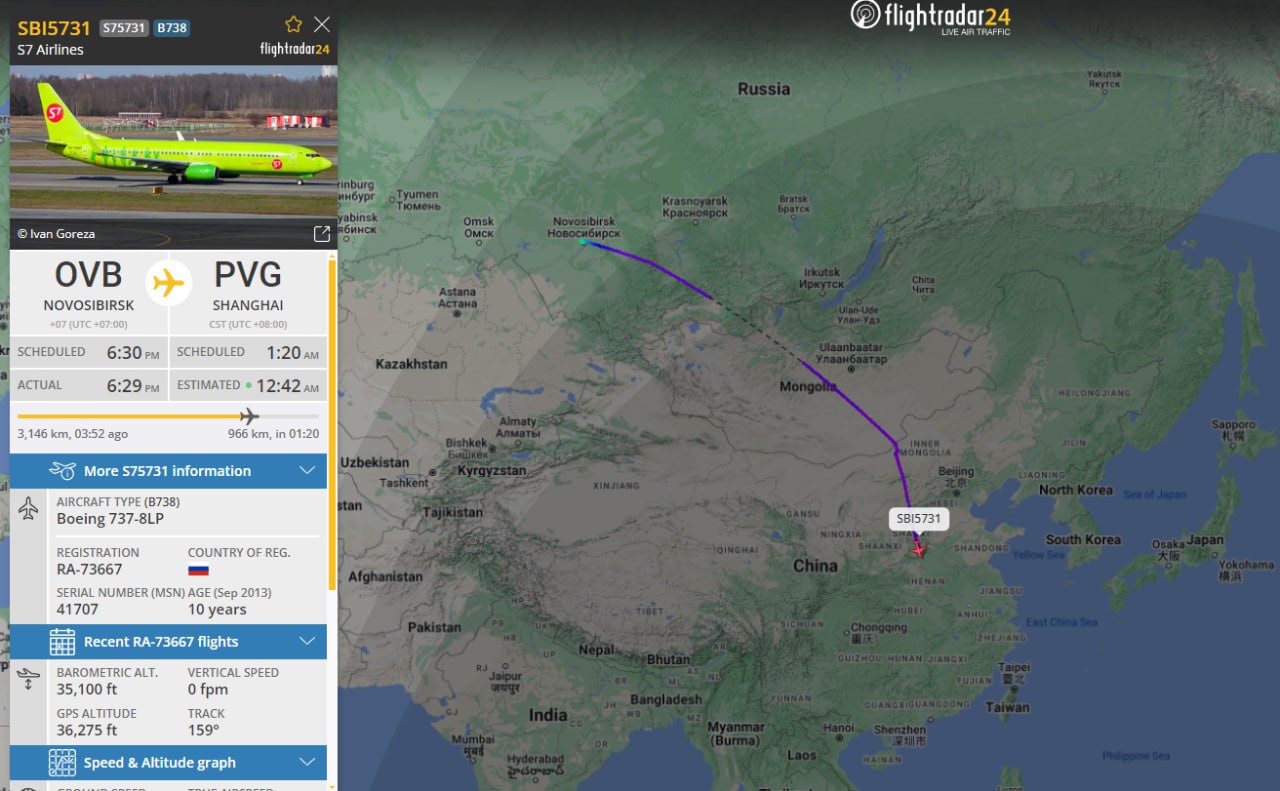 ✈️ Первый рейс S7 SBI5731 Новосибирск — Шанхай уже приближается к пункту назначения.