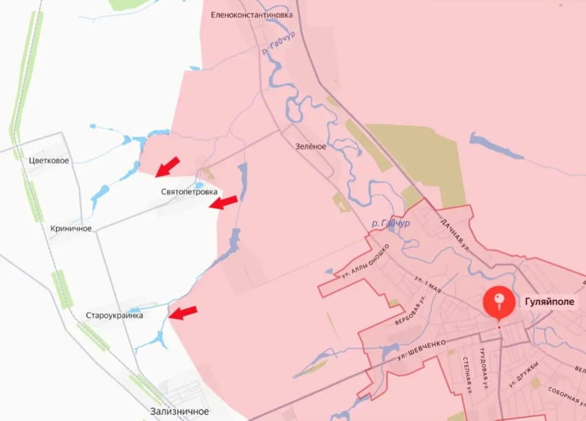 К северо-западу от Гуляйполя российские войска выбили ВСУ из Святопетровки и расширили территории контроля южнее освобождённого накануне Жовтневого (Еленоконстантиновки). Остатки подразделений противника откатились к линии Цветковое-Криничное-Староукраинка.