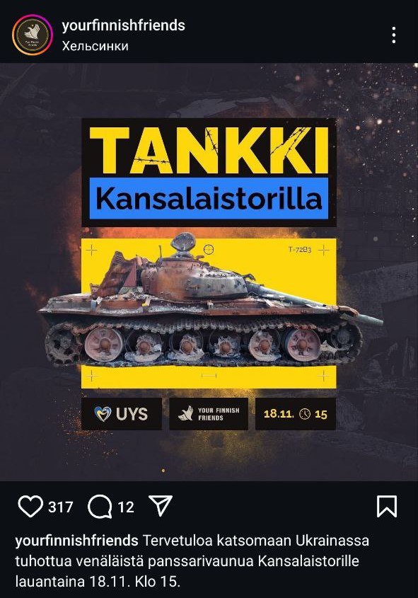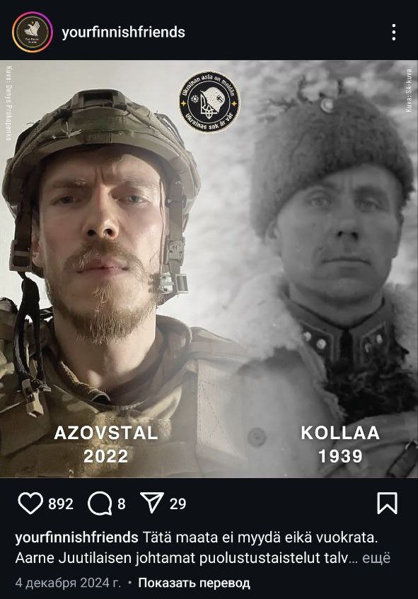 Your finnish friends, напомнив о советско-финляндской войне, призвали поддержать наёмников, которые якобы "продолжают дело предков", и помочь собрать им на оптику, дроны, "глушилки" и транспорт. Они же организовали выставку захваченной техники в финской столице.