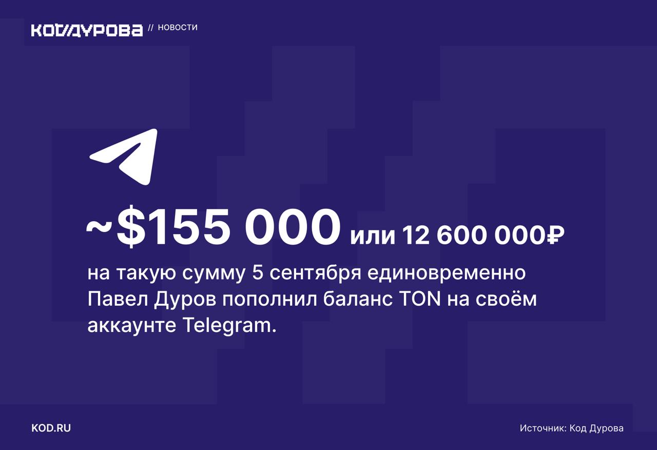 Павел Дуров единовременно пополнил баланс TON на своём аккаунте Telegram на сумму порядка 155 000 долларов или 12 600 000 рублей, выяснил «Код Дурова».