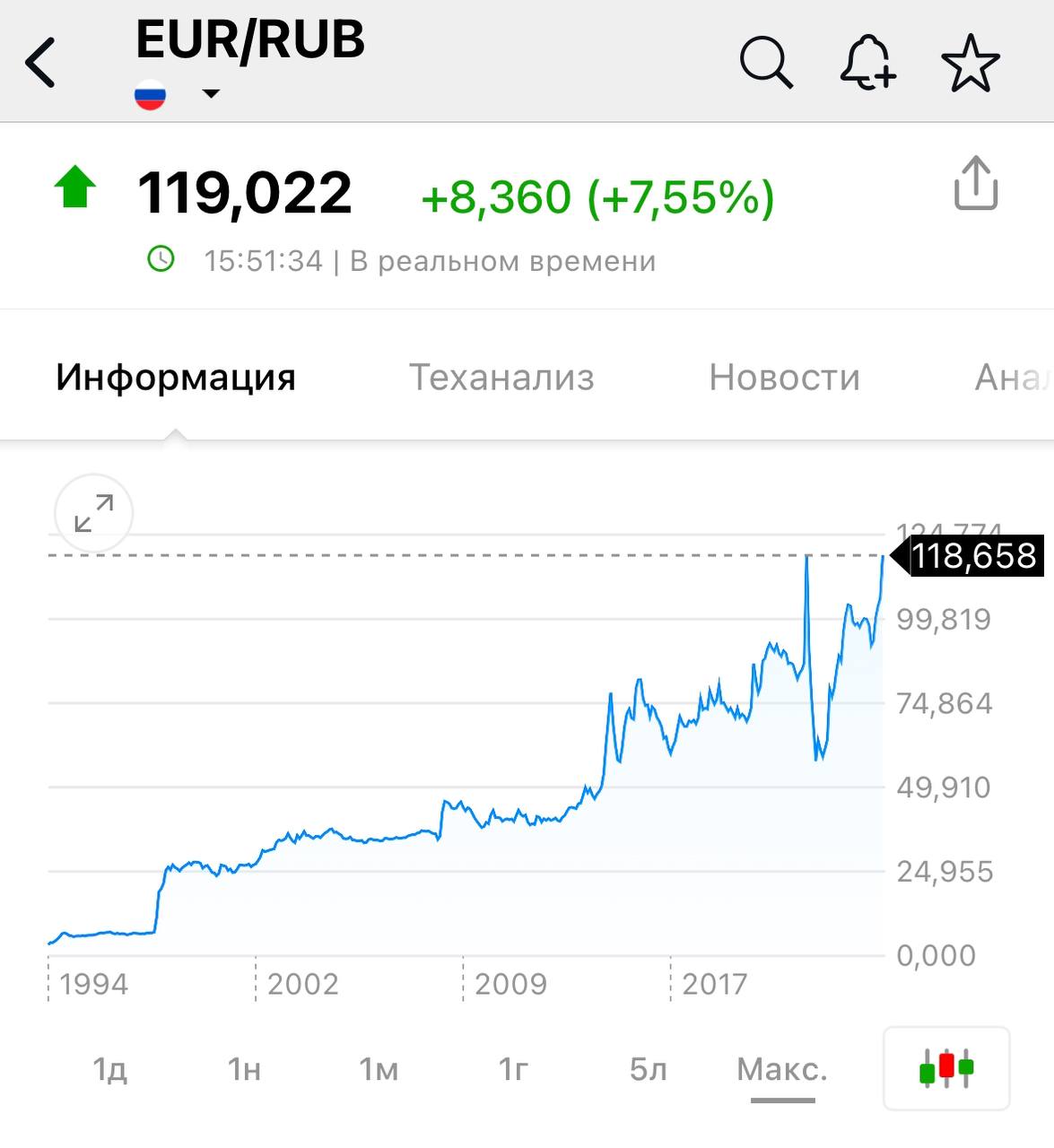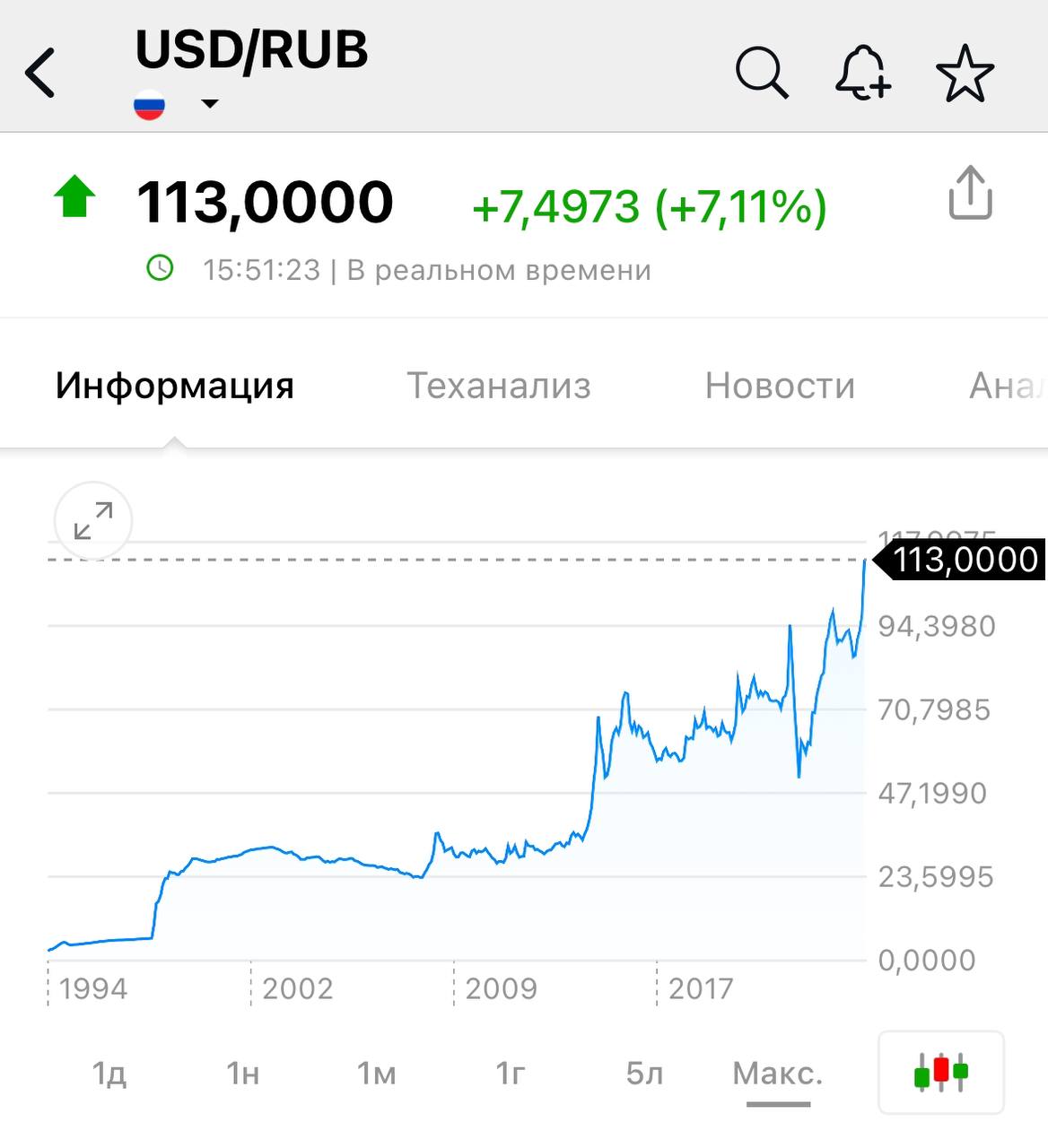 ⚡️Доллар — 113 рублей на бирже, евро — 119 рублей