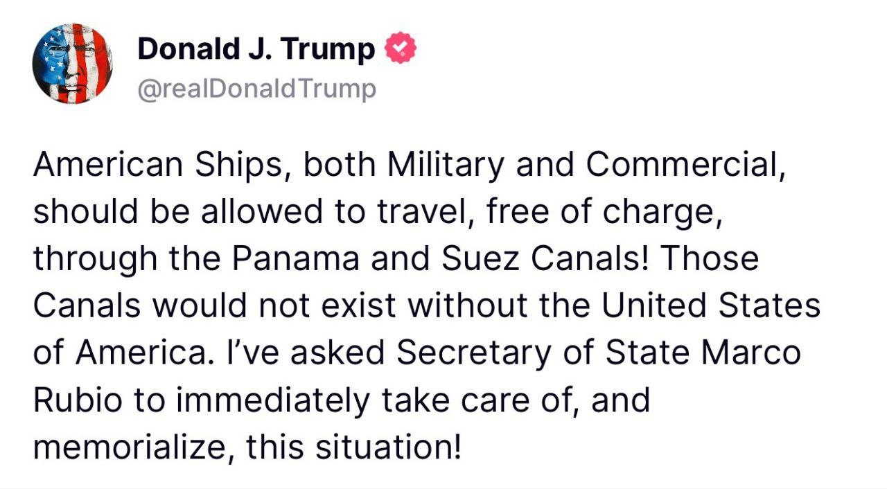 "Американским судам, как военным, так и коммерческим, следует разрешить бесплатное прохождение через Панамский и Суэцкий в каналы! Эти каналы не существовали бы без Соединенных Штатов Америки"