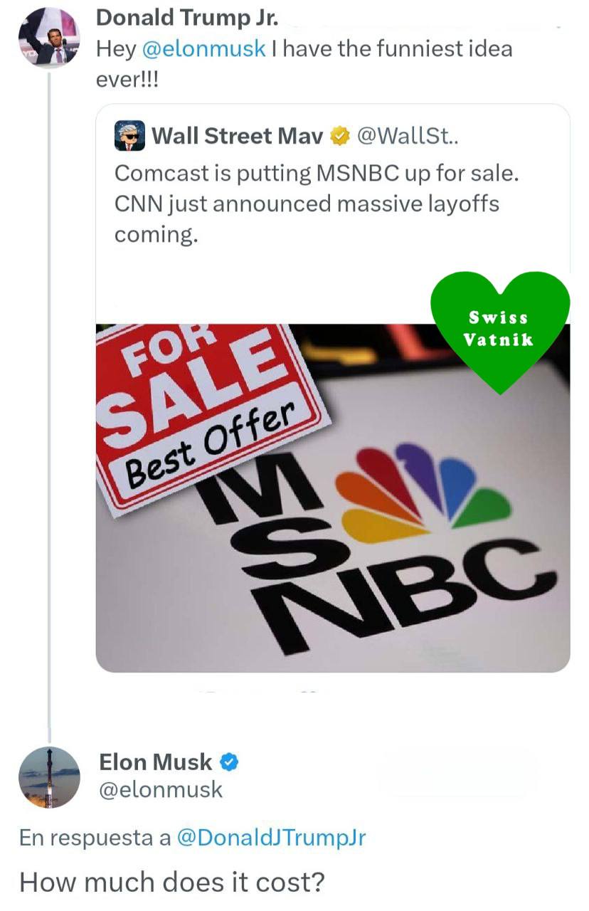 Оказывается после выборов в США, дела у рупора американских демократов телеканала «MSNBC» настолько плохи, что его выставили на продажу. Решив потроллить телеканал, постоянно поливающий помоями Дональда Трампа, его сын тегнул Илона Маска добавив вопрос: «Эй Илон, у меня есть для тебя прикольная идея»! Маск как истинный бизнесмен ответил: «Окей, а сколько это стоит?»