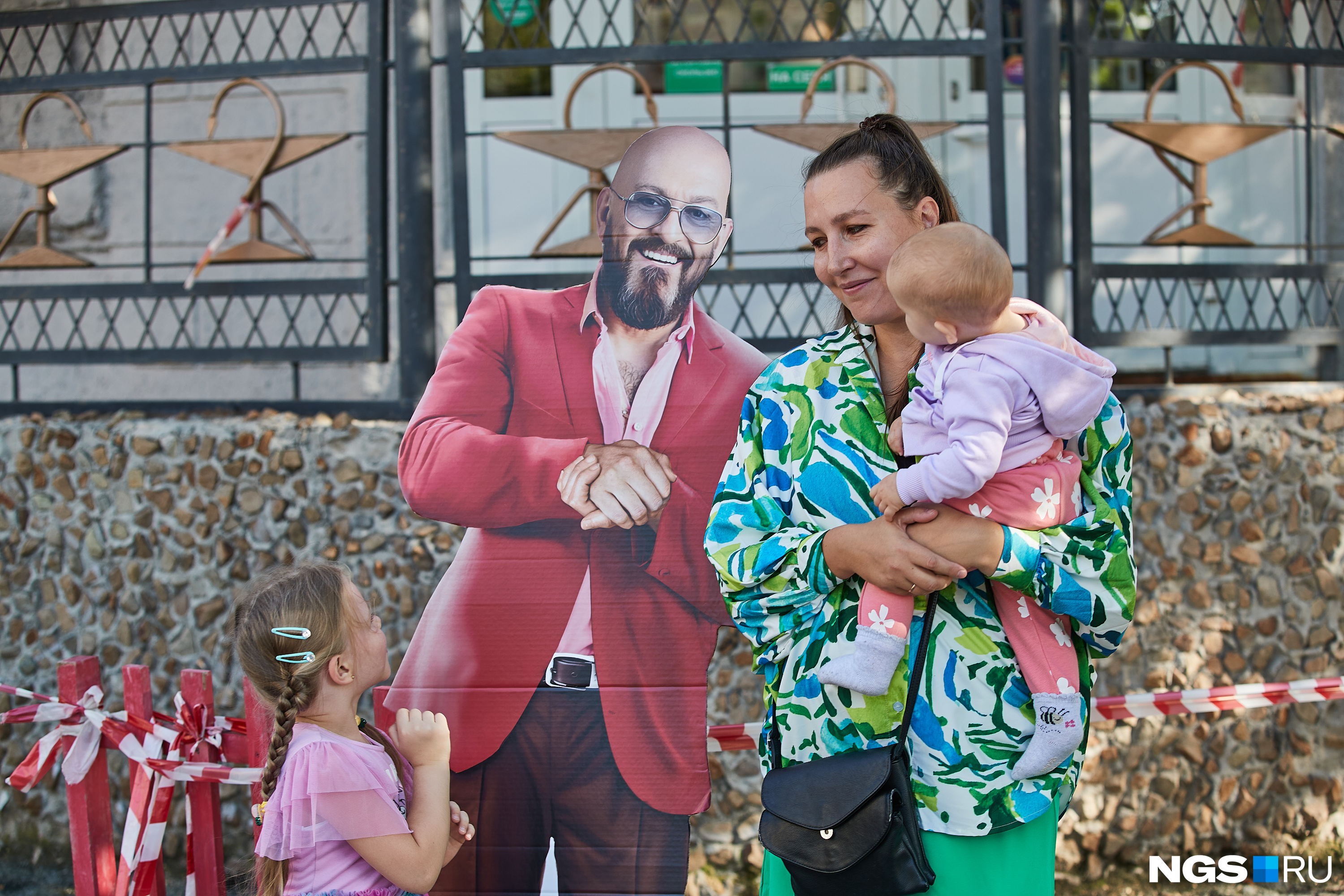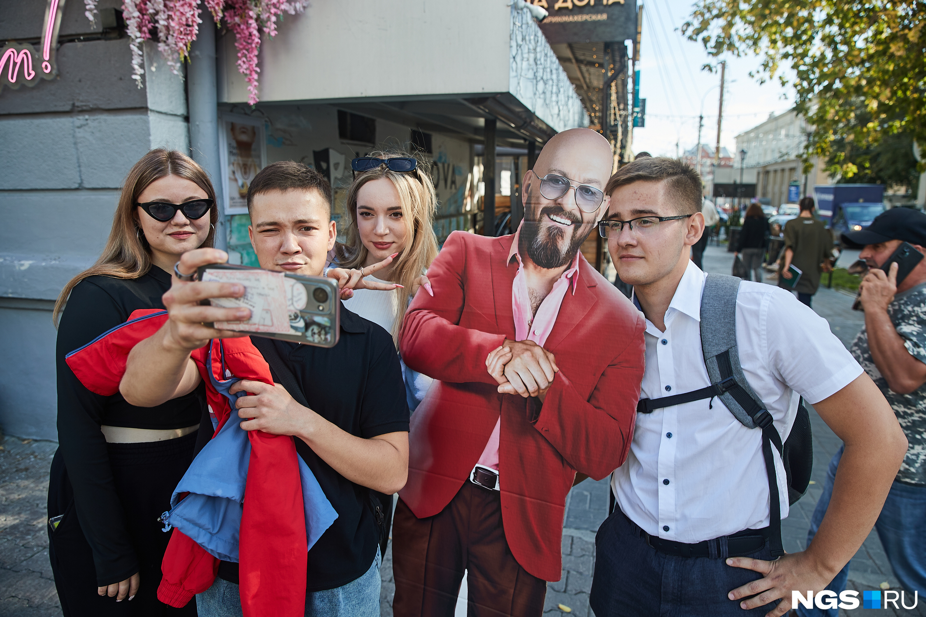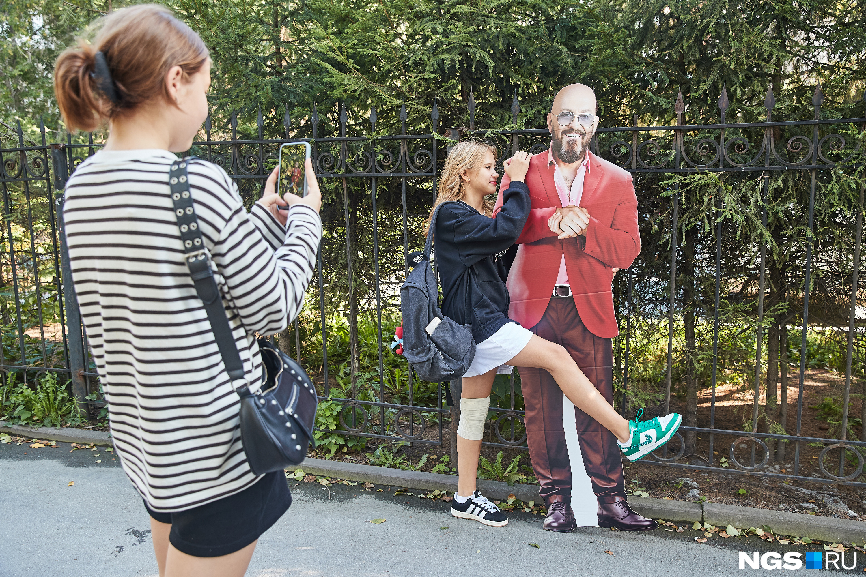 А еще с бодистендом Шуфутинского мы прогулялись по центру города — в районе ресторанного дворика на улице Ленина, Первомайского сквера и сквера «Водник». Некоторые прохожие не реагировали на макет исполнителя. А вот компания подростков примчалась фотографироваться, едва завидев нас в сквере.