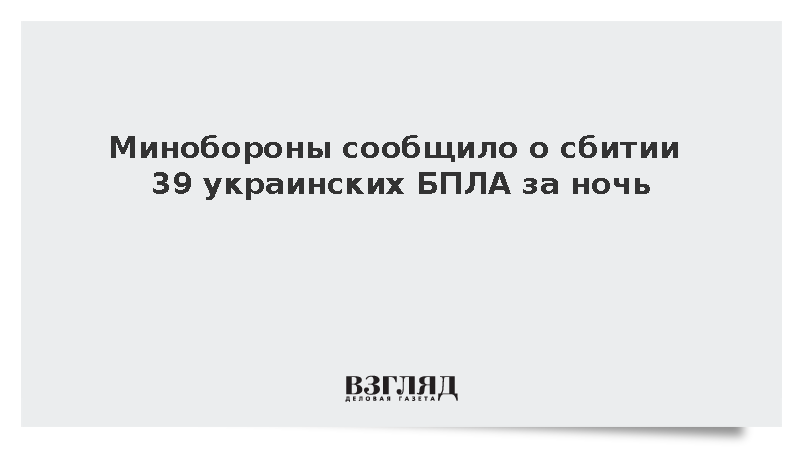 Российские средства противовоздушной обороны за прошедшую ночь перехватили и уничтожили 39 украинских беспилотных летательных аппаратов (БПЛА), передает ТАСС. О действиях ПВО сообщили в Министерстве обороны России. Беспилотники были сбиты над пятью регионами страны, а также в акваториях Черного и Азовского морей.