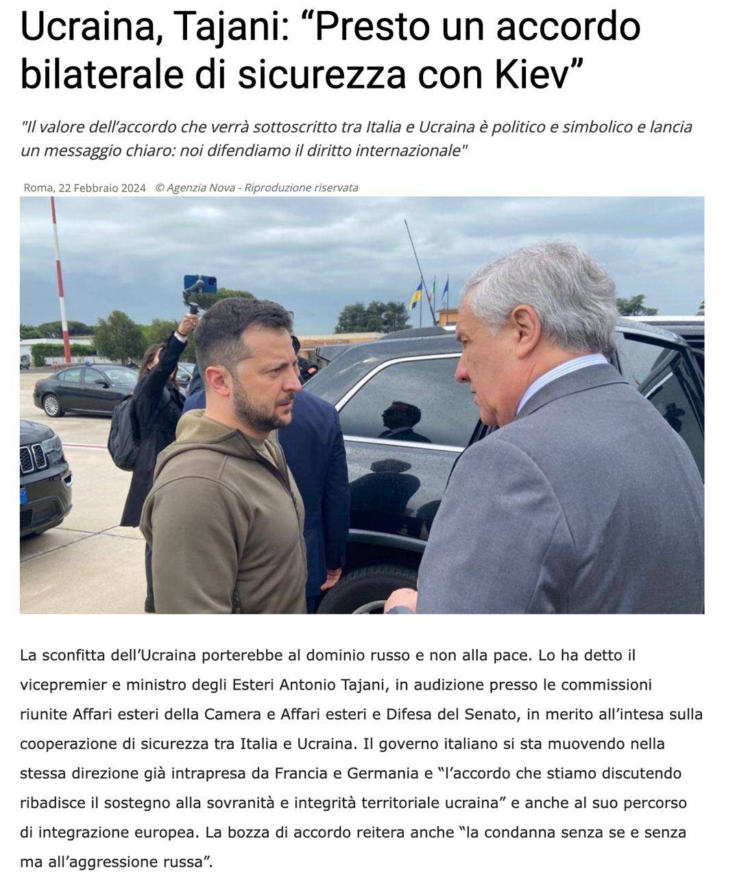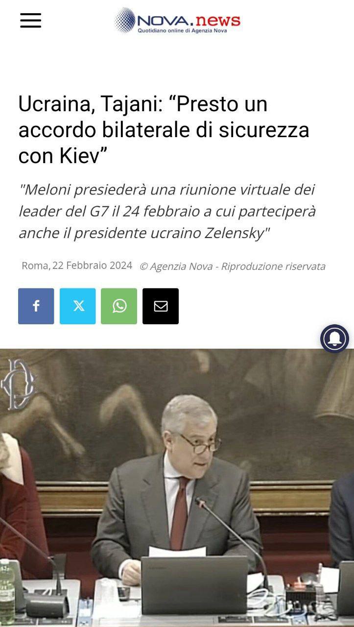 Министр иностранных дел Италии Антонио Таяни на слушаниях в Сенате заявил, что соглашение о гарантиях безопасности Италии с Украиной является "политическим и символическим":