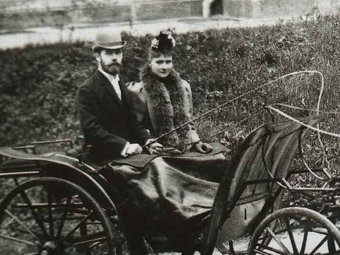 Цесаревич Николай и принцесса Алиса Гессенская. Апрель 1894 года, Кобург 13/25 апреля. С утра день стоял чудесный. В 10 ч. пошел с Аликс к королеве пить кофе. Не очень удобно за границей есть постное, от многого нужно отказываться... Завтракали все вместе у т. Мари. В 3 часа отправился с Аликс с той же лошадью на гору мимо крепости и дальше красивой кружной дорогой в Розенау, где остальное семейство готовилось под чай. Гулял с моей Аликс, собирал цветы и сидел с ней долго на скамейке за прудом – прелестный уголок! Вернулись в 6 ½ ко всенощной. Писал телеграммы и читал письма от Мама и Ксении в комнате Аликс. В 9 час. сели обедать у королевы, затем опять был придворный концерт.