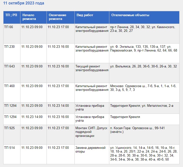Обращаем внимание, что по всем адресам время начала и завершения ремонтных работ, послуживших поводом к отключению света, будут различаться в зависимости от адреса проведения.