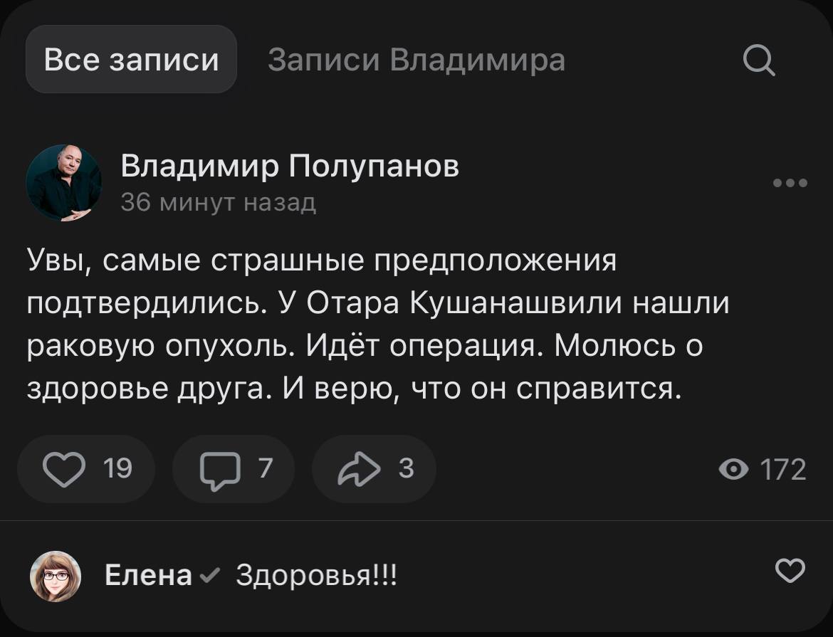 Друг Отара Кушанашвили Владимир Полупанов сообщил, что у журналиста обнаружили рак.