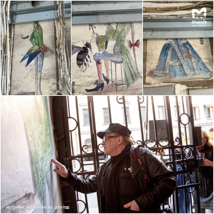 Художник подарил эскизы городу в 2019 году, ко дню основания Петербурга, — мастер лично присутствовал на открытии, вместе со стрит-арт творцами. Также в этом же доме располагается центр Шемякина. Там нам пояснили, что ничего не могут поделать, арка — не их собственность.