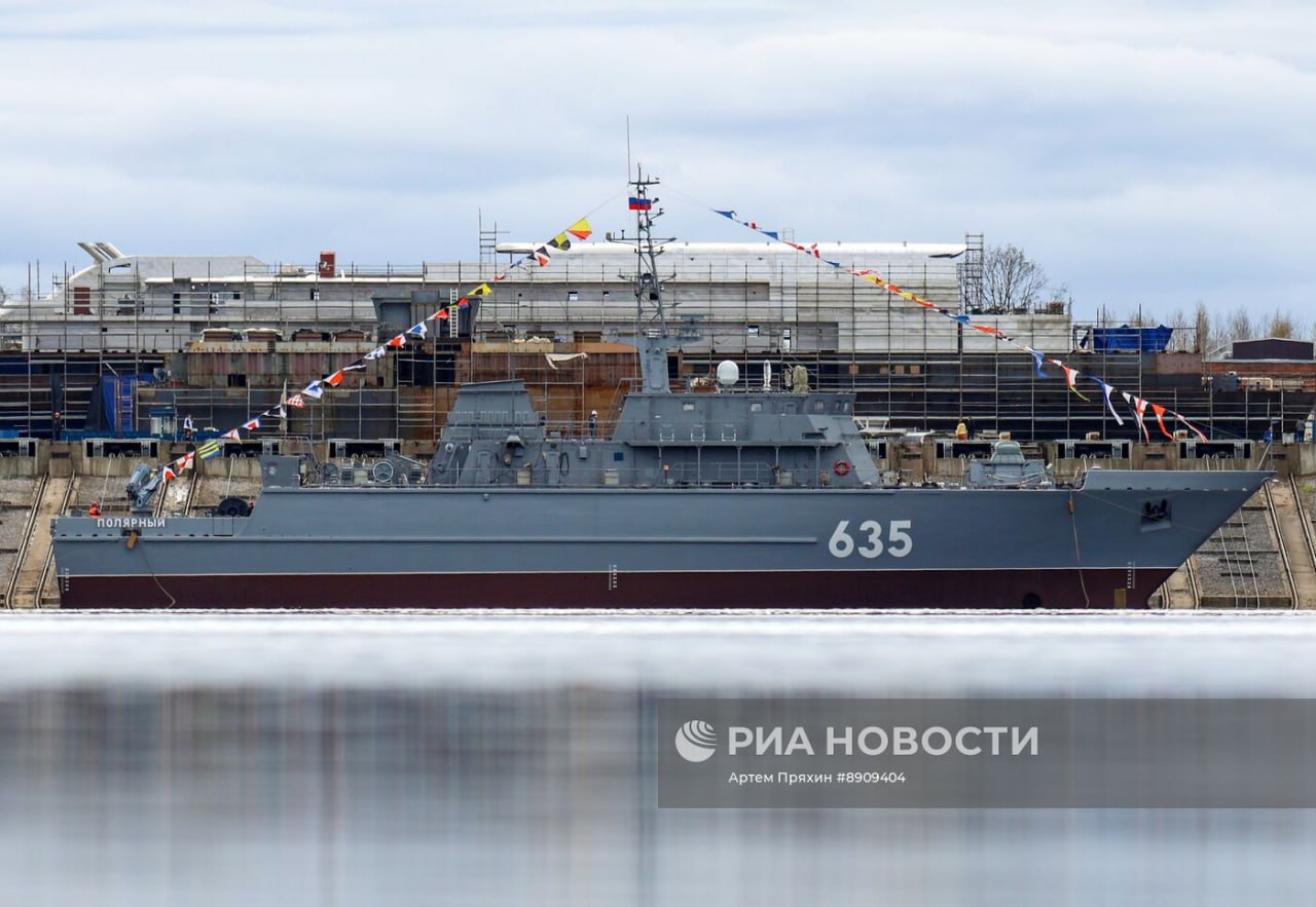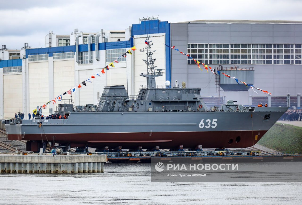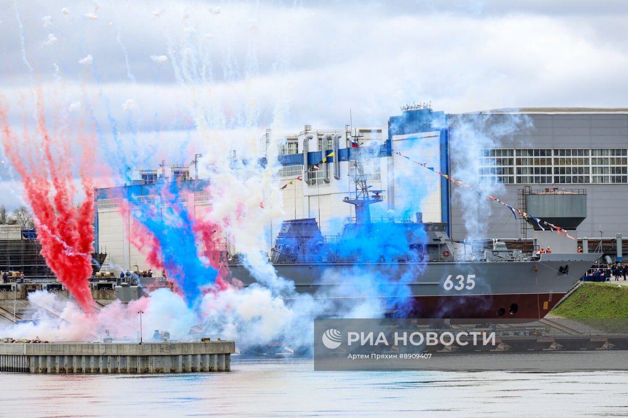 Церемония спуска на воду корабля противоминной обороны "Полярный" проекта 12700 шифр "Александрит" (Средне-Невский судостроительный завод).