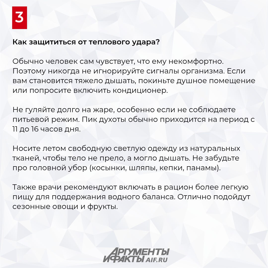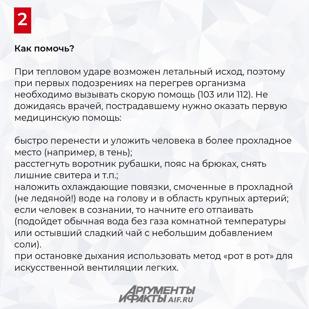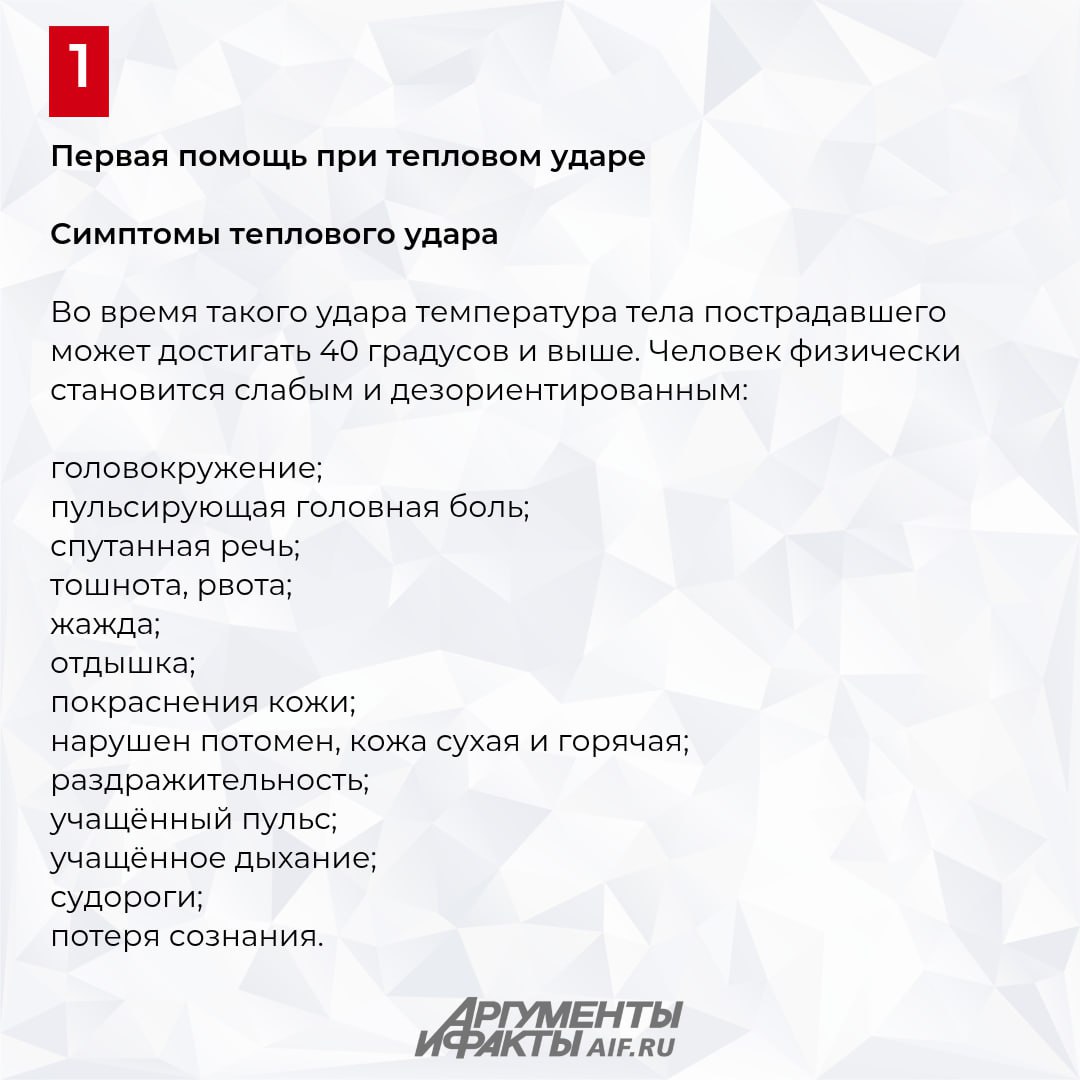 Во время жары у каждого из нас может произойти тепловой удар, когда организм чрезмерно перегревается и не может поддерживать комфортную температуру. Какие симптомы у теплового удара и как помочь себе и другому человеку, если ухудшилось самочувствие — подробнее в карточках.